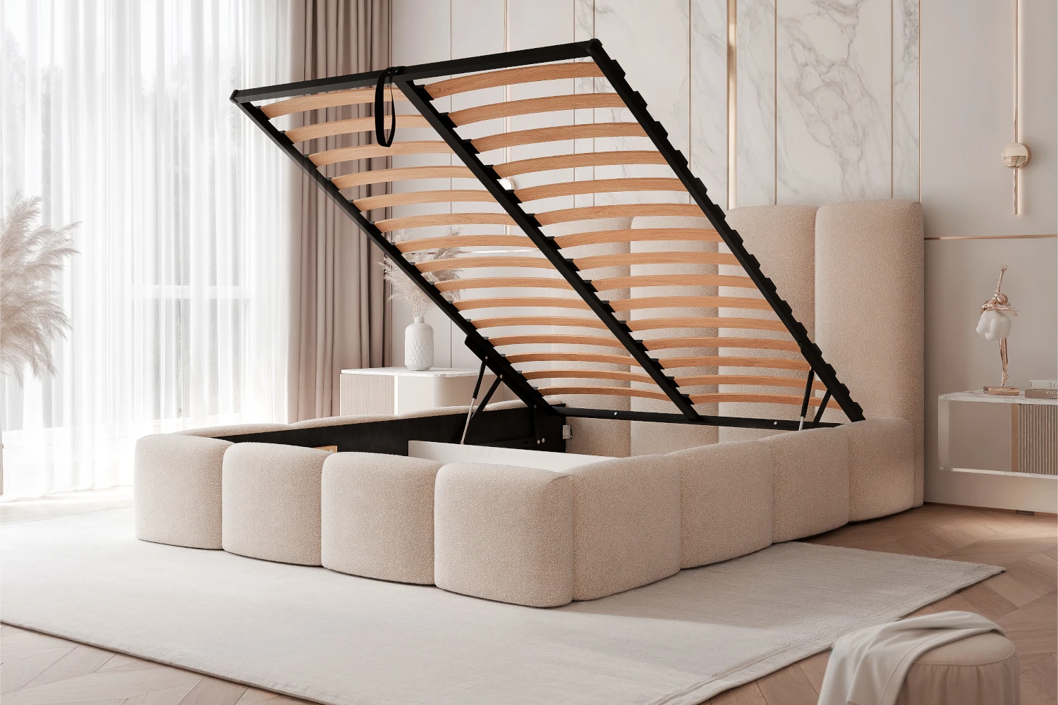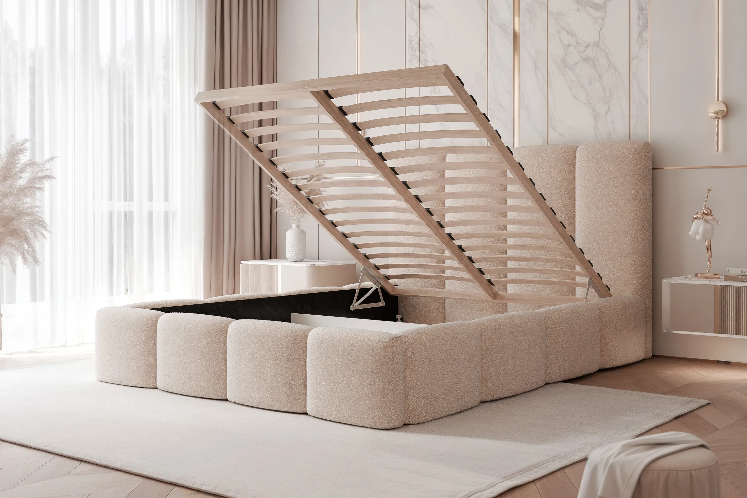 Największą zaletą modelu jest duży pojemnik na pościel umieszczony pod całą powierzchnią spania. To praktyczne miejsce na kołdry, poduszki, koce czy sezonowe tekstylia, dzięki czemu zyskujesz dodatkową przestrzeń do przechowywania bez dokładania kolejnych mebli. Wnętrze łóżka zostało wykończone materiałem typu wigofil, a elementy konstrukcyjne, takie jak listwa wewnętrzna i podłoga pojemnika, wykonano z białej płyty laminowanej - całość jest estetyczna i łatwa do utrzymania w czystości. Komfort użytkowania wspiera solidny stelaż drewniany z 32 listwami, który dobrze współpracuje z materacem. Dzięki temu łóżko z pojemnikiem na pościel Cozy sprawdzi się zarówno w sypialni małżeńskiej, jak i w pokoju gościnnym czy mieszkaniu, gdzie liczy się każdy metr przestrzeni. Boki łóżka mają ok. 35 cm wysokości, co nadaje bryle stabilny, “otulający” charakter, a jednocześnie podkreśla tapicerowane wykończenie.