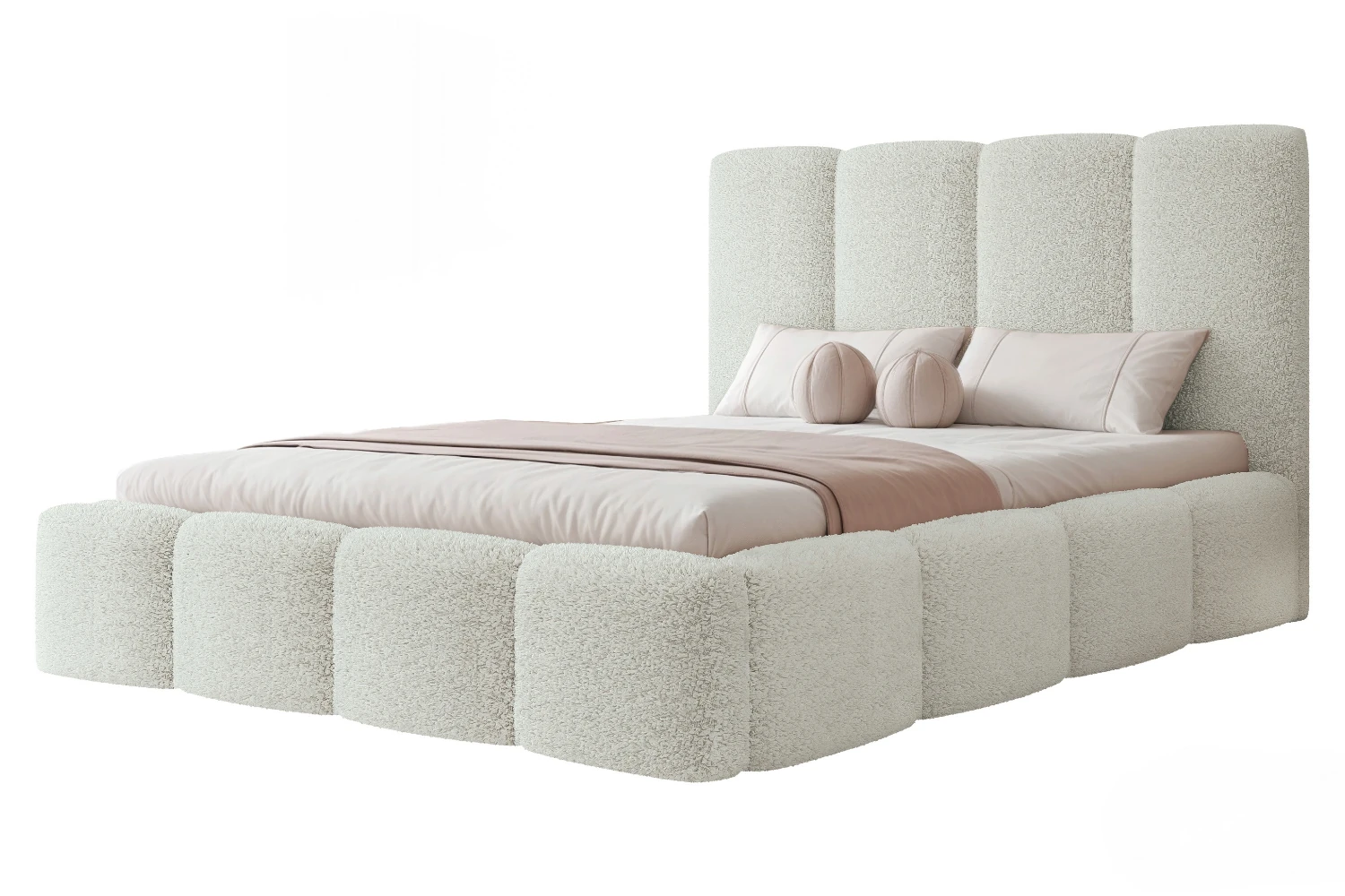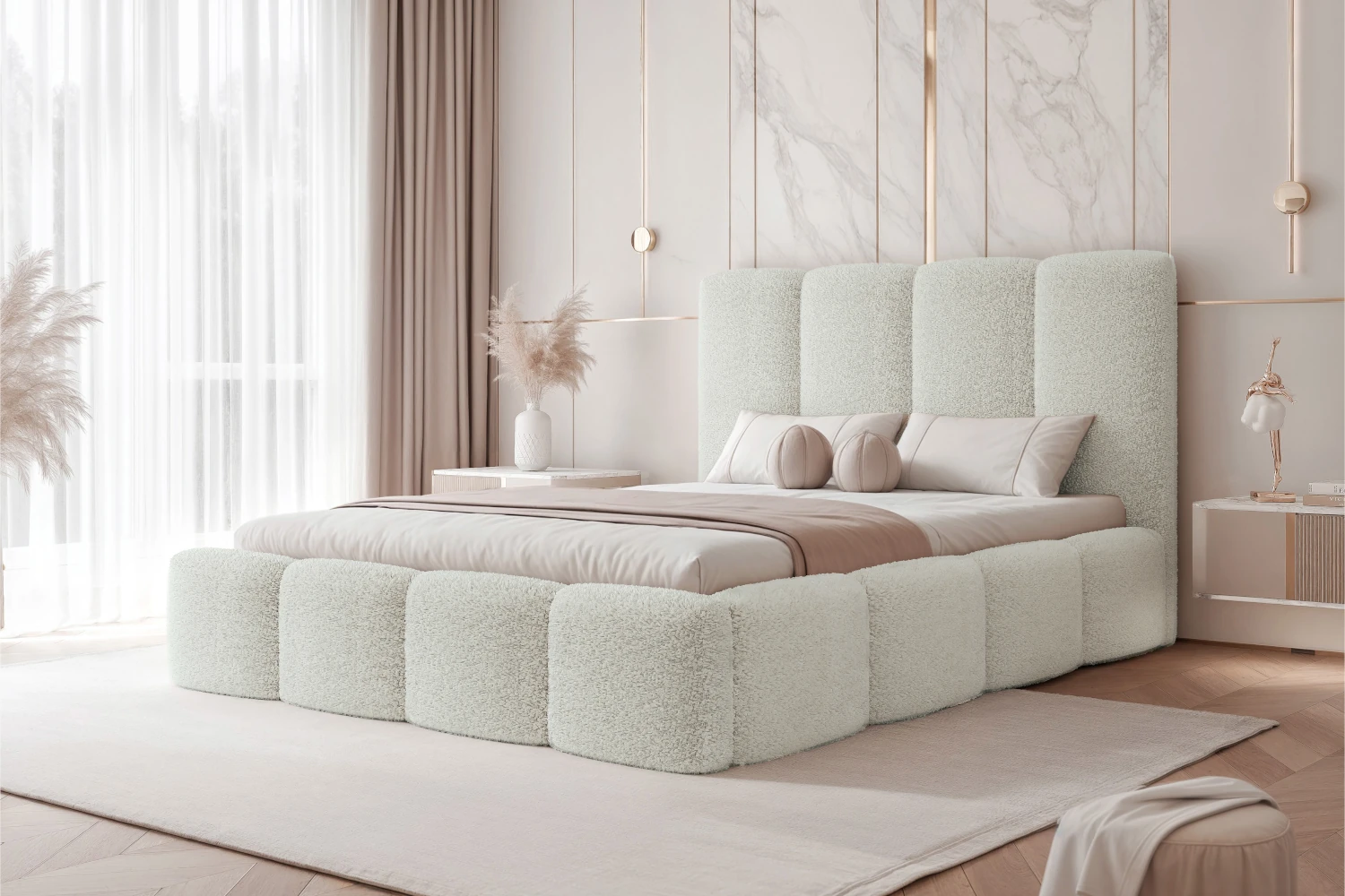 Łóżko tapicerowane do sypialni Cozy to połączenie miękkiej, modnej tapicerki bouclé i praktycznych rozwiązań na co dzień. Model ma wygodny, wysoki zagłówek oraz pojemny pojemnik na pościel pod całą powierzchnią spania, dzięki czemu łatwo utrzymasz porządek w sypialni. W komplecie znajduje się stelaż drewniany, a łóżko dostępne jest w kilku szerokościach, więc dopasujesz je do wielkości materaca i wnętrza.
