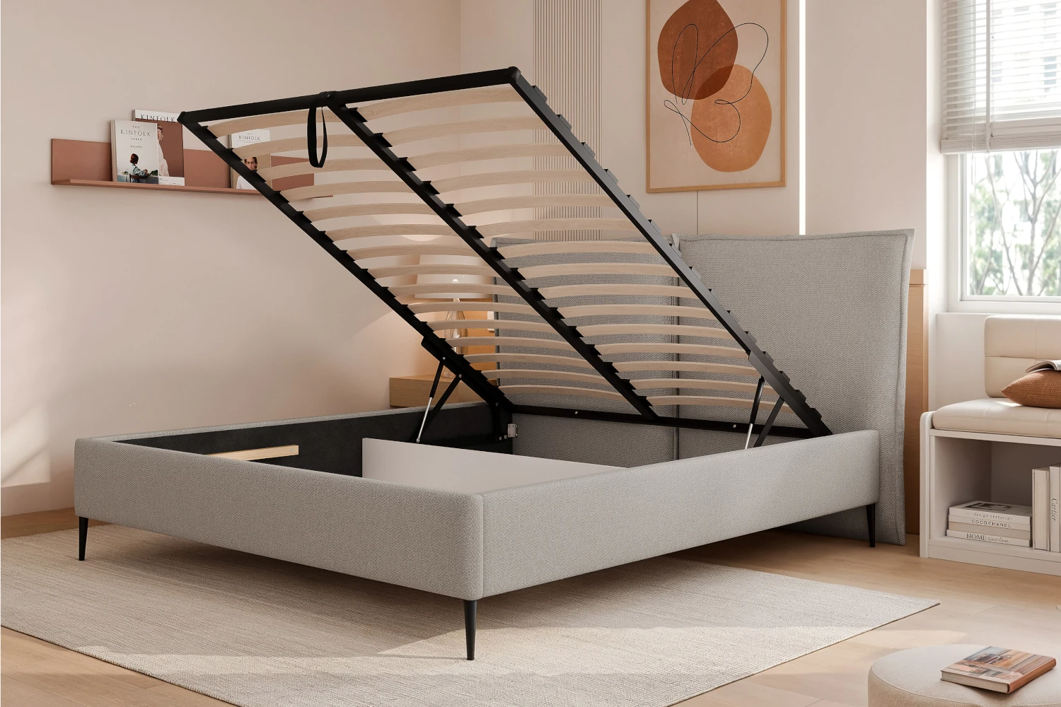 Komfort snu wspiera stelaż drewniany składający się z 32 listew - stabilny, sprężysty i odpowiedni do większości materacy. Konstrukcja została zaprojektowana z myślą o trwałości, a łóżko tapicerowane z pojemnikiem świetnie sprawdzi się zarówno w sypialni pary, jak i w pokoju gościnnym. Wysokość nóżek ok. 15 cm nadaje lekkości bryle i ułatwia sprzątanie pod łóżkiem.