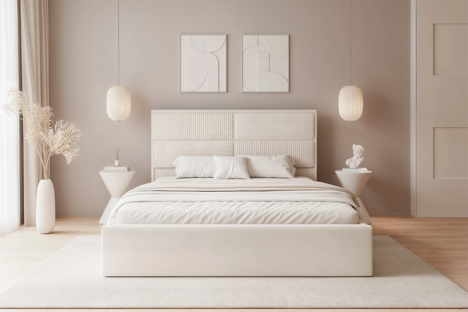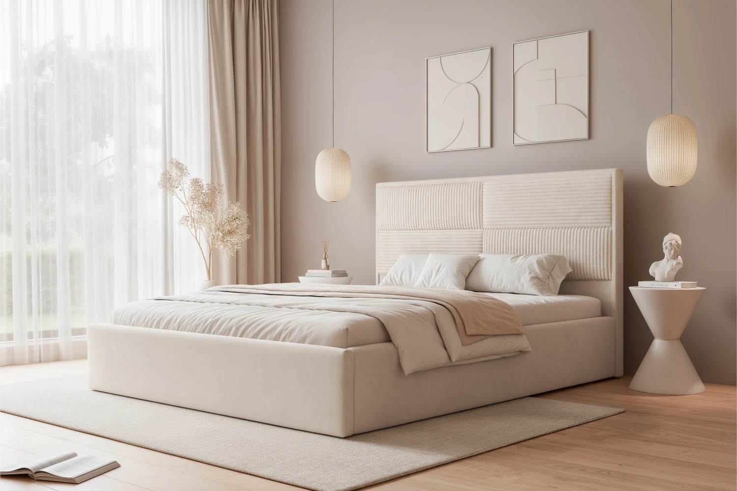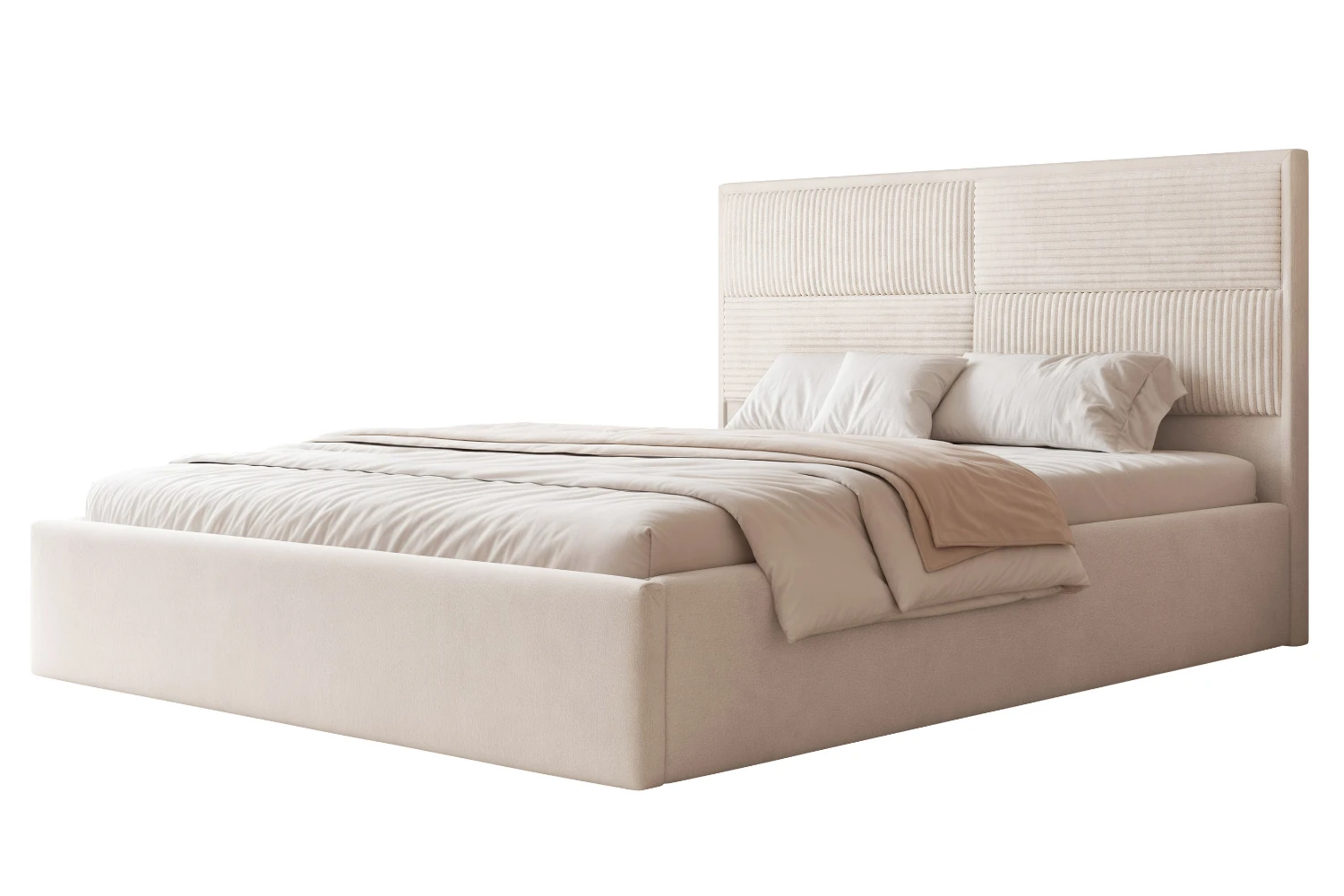 W standardzie otrzymujesz drewniany stelaż, który zapewnia stabilne podparcie materaca i wspiera codzienny komfort snu. Praktyczny pojemnik na pościel pod całą powierzchnią łóżka ułatwia przechowywanie kołder, poduszek i tekstyliów sezonowych, dzięki czemu zyskujesz dodatkową przestrzeń w szafie. W modelu Sofia zostały połączone dwa rodzaje tkanin plusz (Paros 1) oraz sztruks (Poso 100), który zdobi zagłówek, ze starannie wykonanych paneli tapicerowanych.
