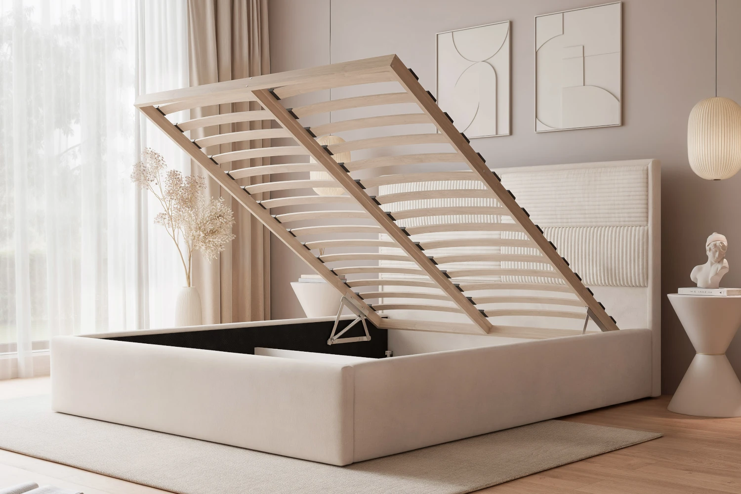 W standardzie otrzymujesz drewniany stelaż, który zapewnia stabilne podparcie materaca i wspiera codzienny komfort snu. Praktyczny pojemnik na pościel pod całą powierzchnią łóżka ułatwia przechowywanie kołder, poduszek i tekstyliów sezonowych, dzięki czemu zyskujesz dodatkową przestrzeń w szafie. W modelu Sofia zostały połączone dwa rodzaje tkanin plusz (Kronos 40) oraz sztruks (Poso 40), który zdobi zagłówek, ze starannie wykonanych paneli tapicerowanych.