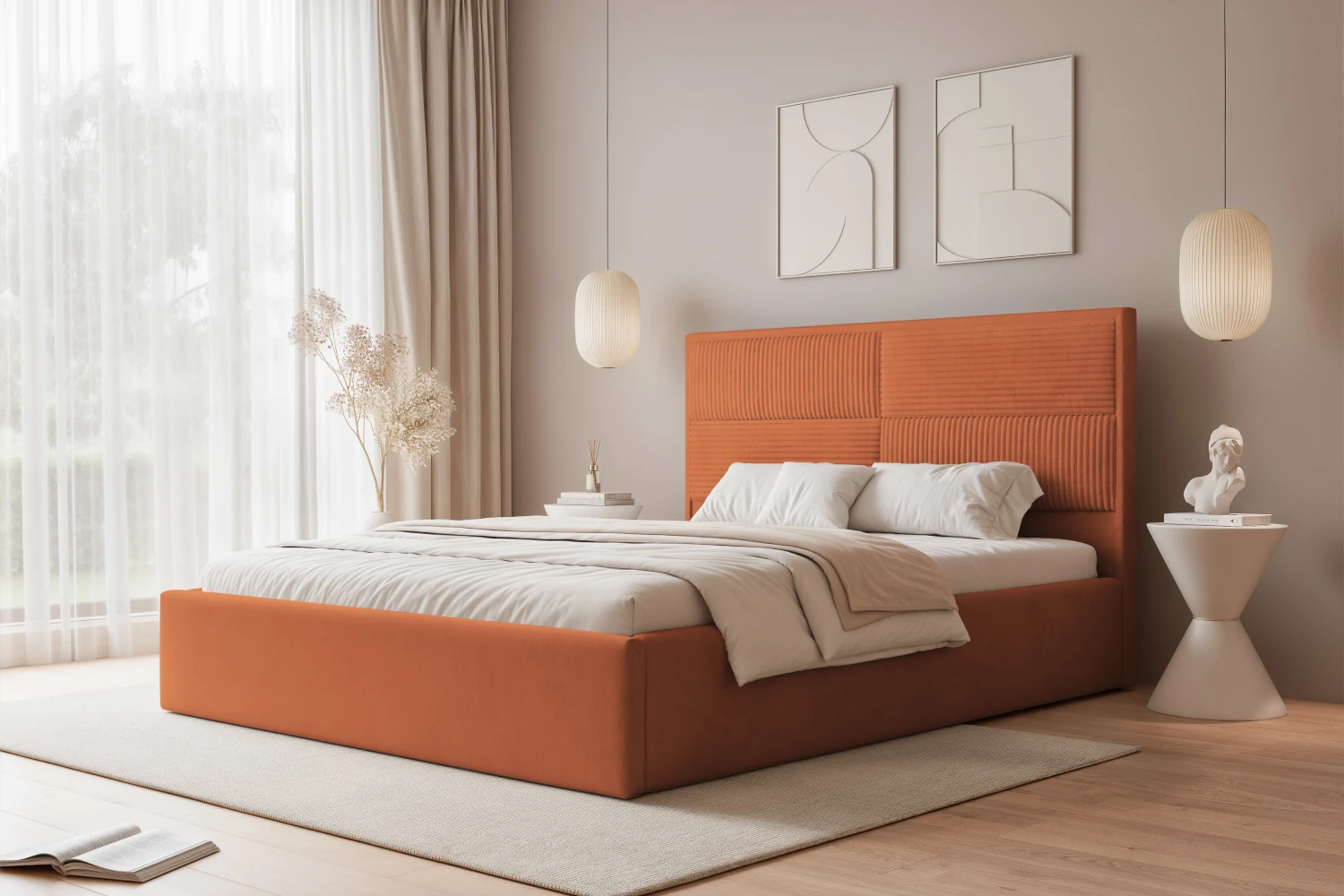 Łóżko tapicerowane do sypialni z pojemnikiem na pościel Sofia Miedziany