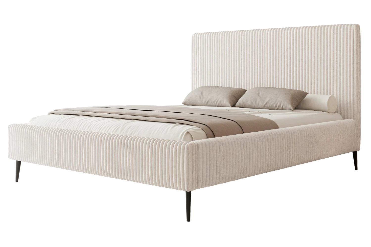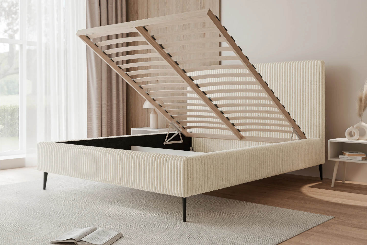 Łóżko tapicerowane na nóżkach z pojemnikiem na pościel i stelażem Luxo Jasny krem