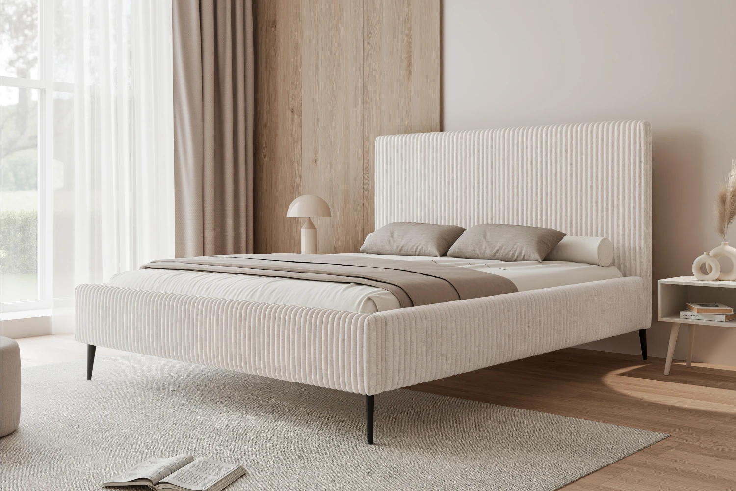 Model dostępny jest w kilku wariantach szerokości spania: 120/140/160/180/200 cm, dzięki czemu łatwo dopasujesz go do metrażu i swoich potrzeb. Tapicerka: tkanina Tilia 01 w kolorze jasny krem prezentuje się elegancko i wprowadza do sypialni przytulny charakter. Dodatkowo możesz spersonalizować wygląd, wybierając kolor nóżek: czarny lub złoty - tak, aby dopasować łóżko do pozostałych dodatków.