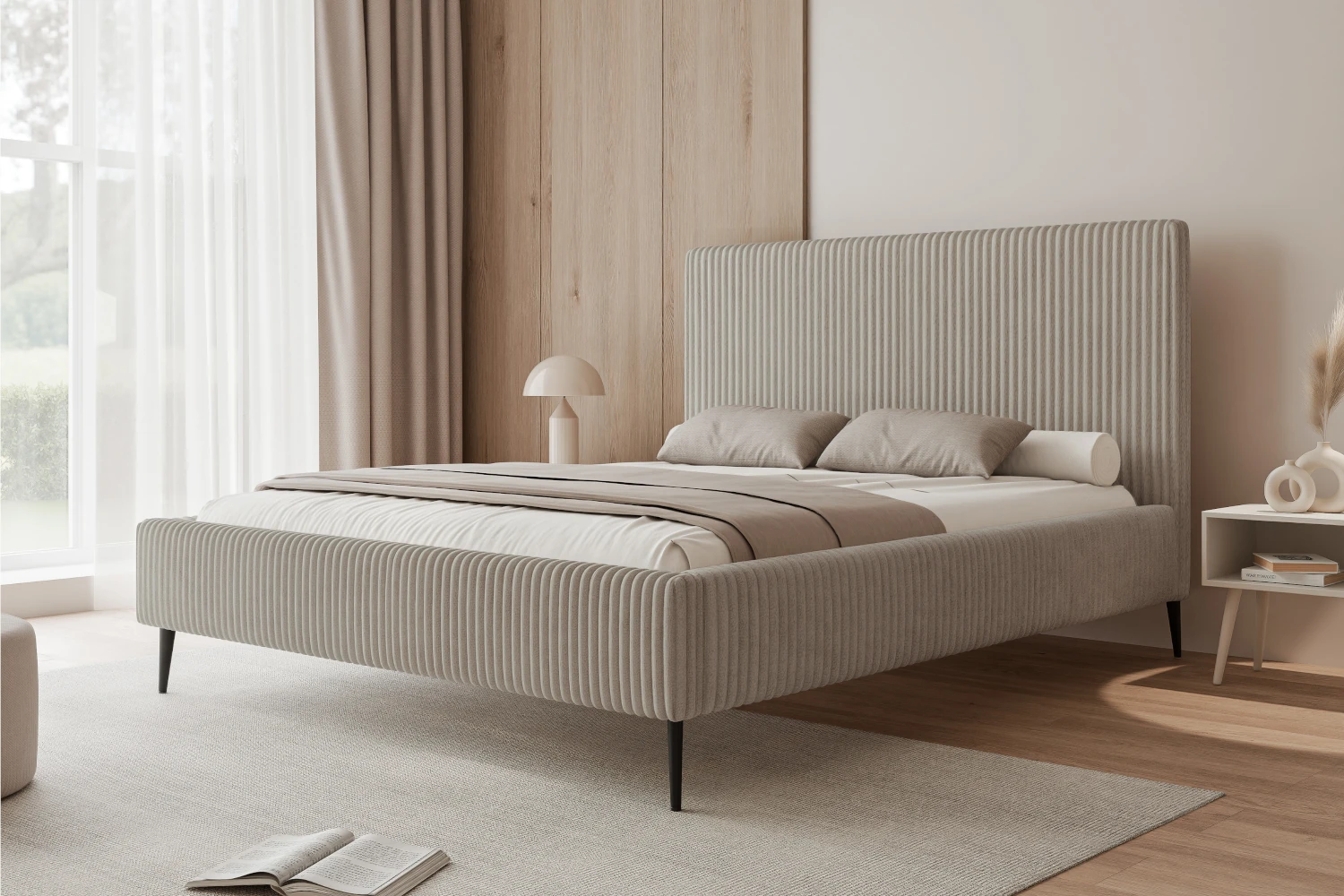 Model dostępny jest w kilku wariantach szerokości spania: 120/140/160/180/200 cm, dzięki czemu łatwo dopasujesz go do metrażu i swoich potrzeb. Tapicerka: tkanina Tilia 11 w kolorze szampańskim prezentuje się elegancko i wprowadza do sypialni przytulny charakter. Dodatkowo możesz spersonalizować wygląd, wybierając kolor nóżek: czarny lub złoty - tak, aby dopasować łóżko do pozostałych dodatków.