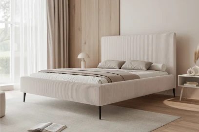 Model dostępny jest w kilku wariantach szerokości spania: 120/140/160/180/200 cm, dzięki czemu łatwo dopasujesz go do metrażu i swoich potrzeb. Tapicerka: tkanina Poso 100 w kolorze waniliowym prezentuje się elegancko i wprowadza do sypialni przytulny charakter. Dodatkowo możesz spersonalizować wygląd, wybierając kolor nóżek: czarny lub złoty - tak, aby dopasować łóżko do pozostałych dodatków.