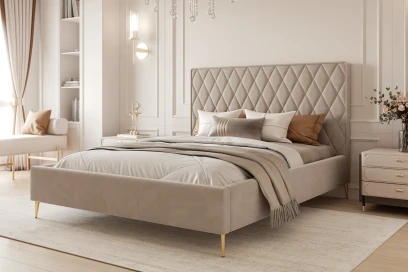 Łóżko tapicerowane z nóżkami Royal to propozycja dla osób, które szukają stylowego i praktycznego rozwiązania do nowoczesnej sypialni. Miękka, przyjemna w dotyku tapicerka (Magic Velvet 2210) podkreśla przytulny charakter wnętrza, a wysokie, pionowe przeszycia na zagłówku nadają całości eleganckiego, hotelowego wyglądu. Dzięki temu łóżko do sypialni stanowi mocny element aranżacji - pasuje zarówno do jasnych, jak i bardziej kontrastowych dodatków.