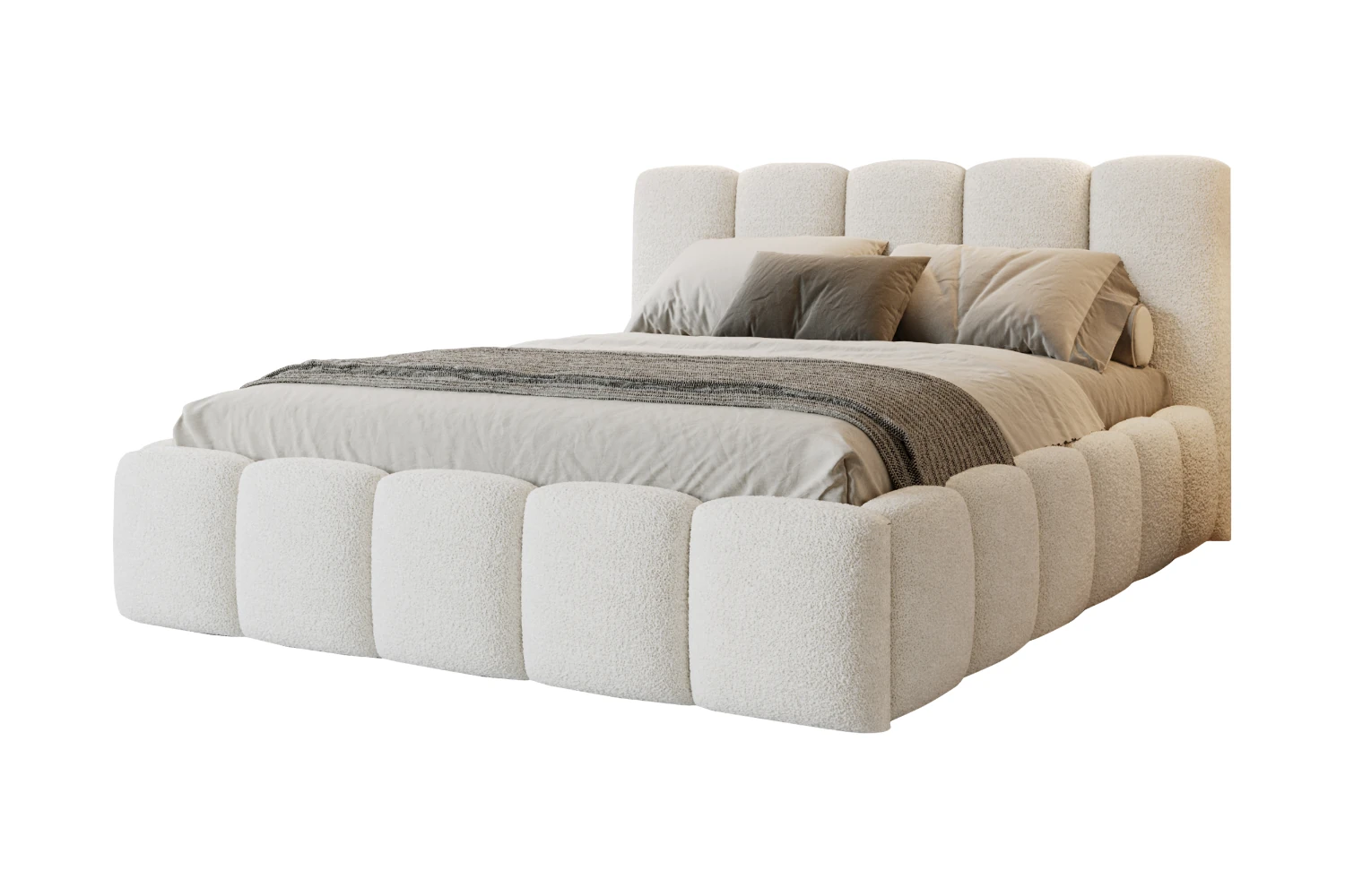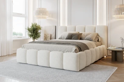 Łóżko tapicerowane Nubela to idealny wybór dla osób, które szukają wygodnego i jednocześnie bardzo efektownego łóżka do sypialni. Miękkie, modułowe przeszycia i wysokie wezgłowie tworzą przytulną oprawę strefy snu, a tapicerka z przyjemnej w dotyku tkaniny boucle Quelle 01 w odcieniu kremowej bieli dodaje wnętrzu elegancji i lekkości. Prosta bryła z zaoblonymi krawędziami świetnie komponuje się z nowoczesnymi, skandynawskimi i minimalistycznymi aranżacjami.