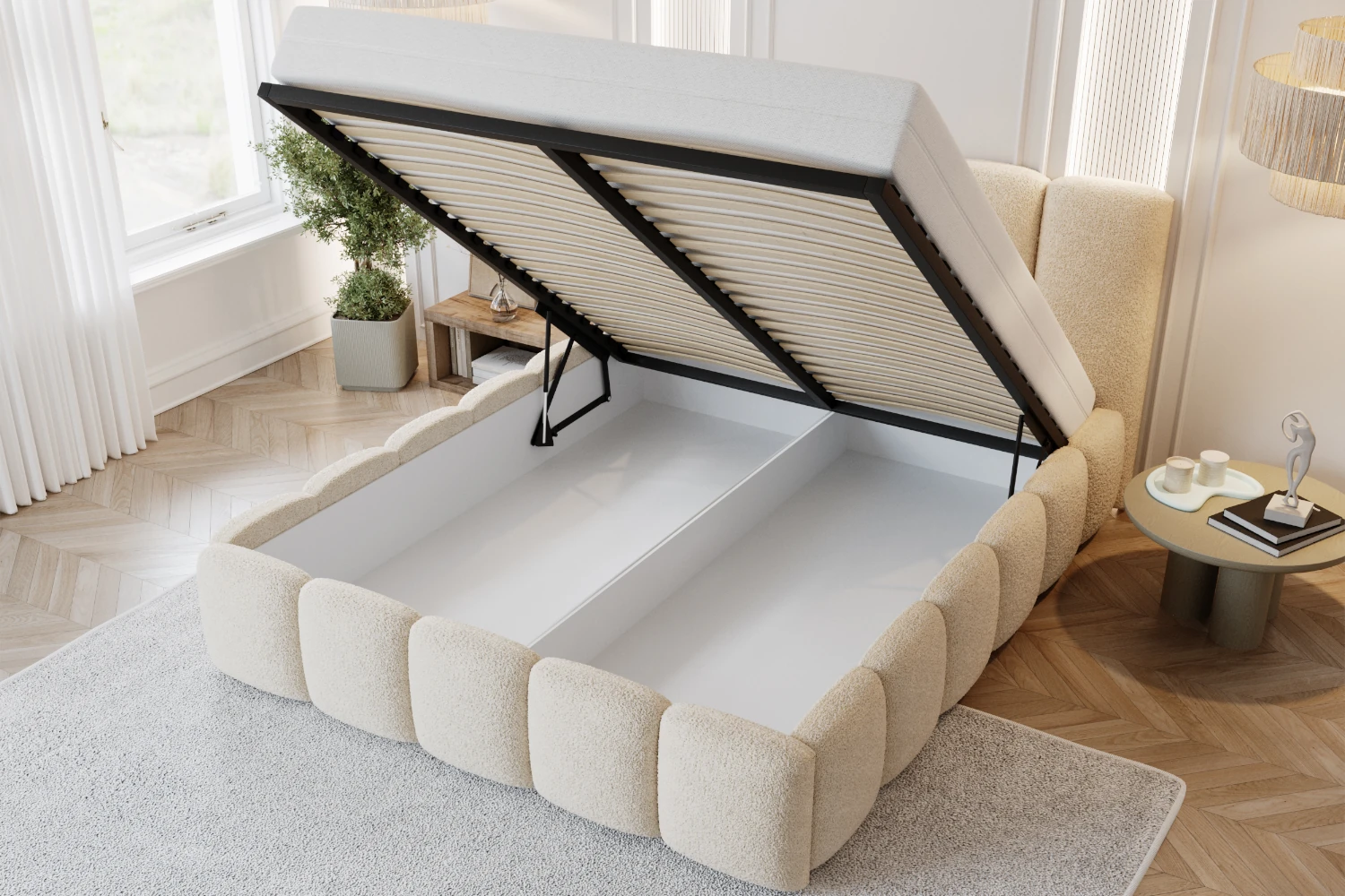Nubela została wyposażona w duży, łatwo dostępny pojemnik na pościel, który pomieści kołdry, poduszki, koce i dodatkowe tekstylia. Stelaż podnoszony jest za pomocą siłowników, co ułatwia codzienne korzystanie z schowka. W zestawie znajduje się metalowy stelaż z listwami, zapewniający stabilne podparcie dla materaca i komfortowy sen.