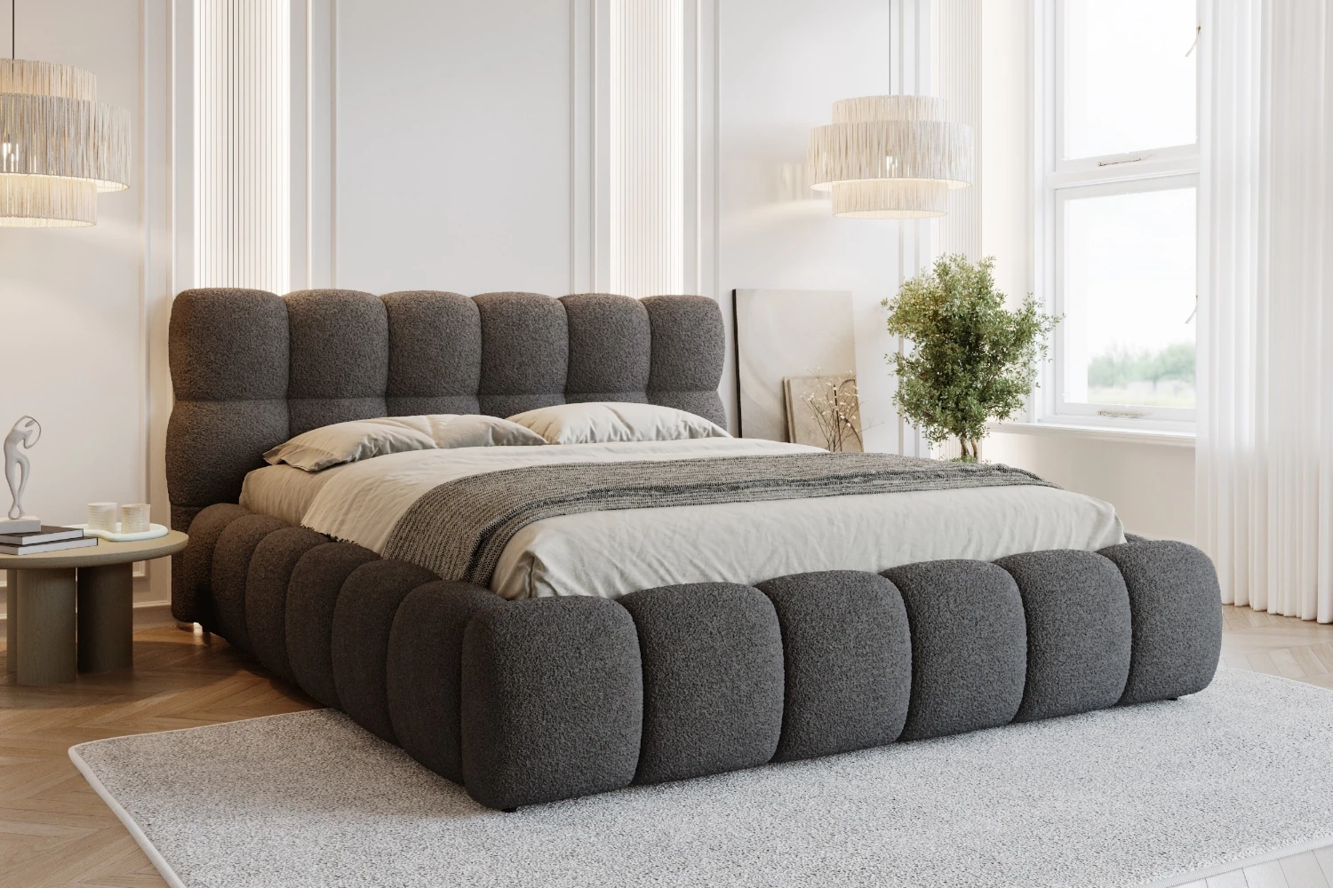 Łóżko tapicerowane Puffo to propozycja dla osób, które szukają wygodnego i efektownego łóżka małżeńskiego z dużym pojemnikiem na pościel. Miękka, pikowana rama dookoła oraz wysokie wezgłowie tworzą przytulny „kokon”, który sprzyja relaksowi po całym dniu. Dzięki solidnemu, metalowemu stelażowi łóżko jest stabilne i świetnie sprawdzi się w codziennym użytkowaniu.