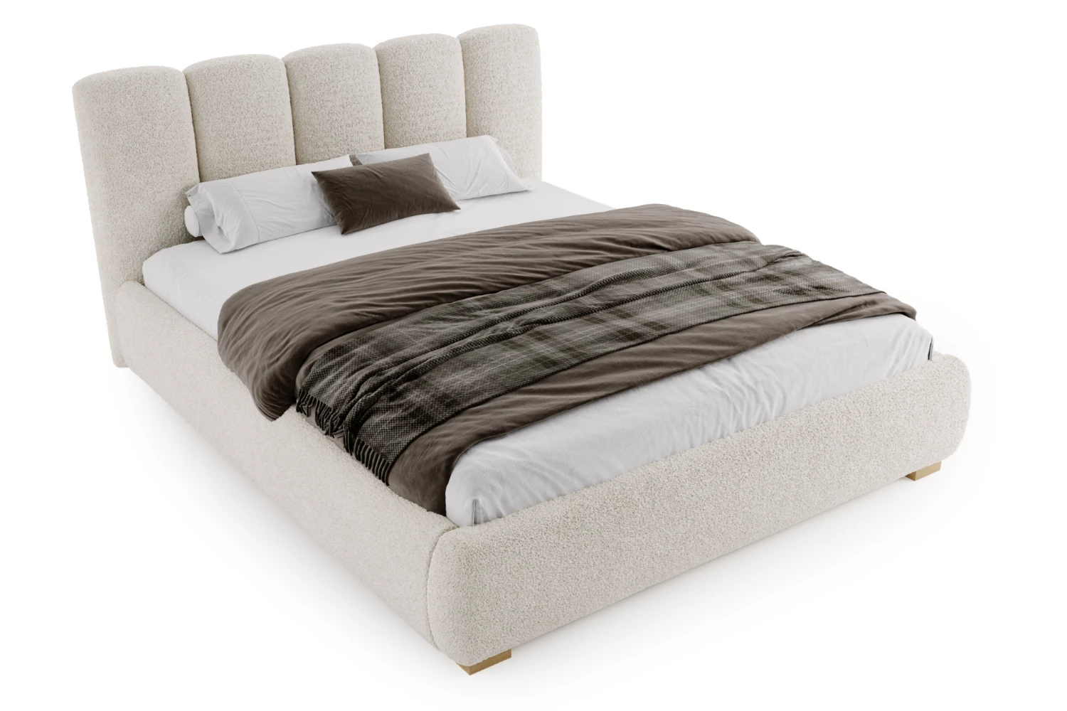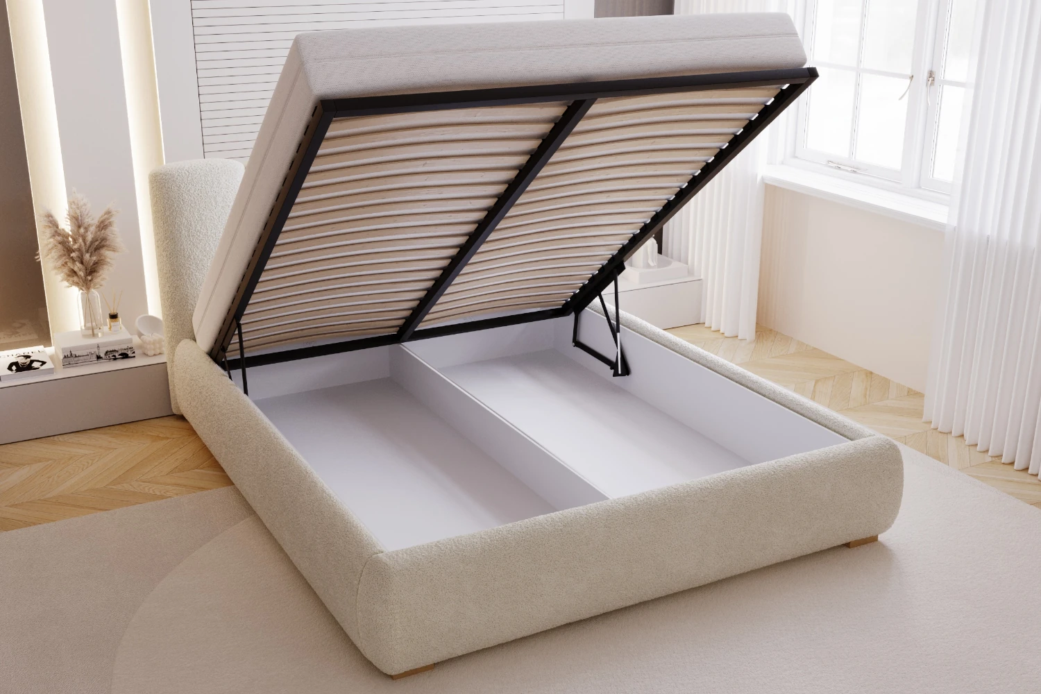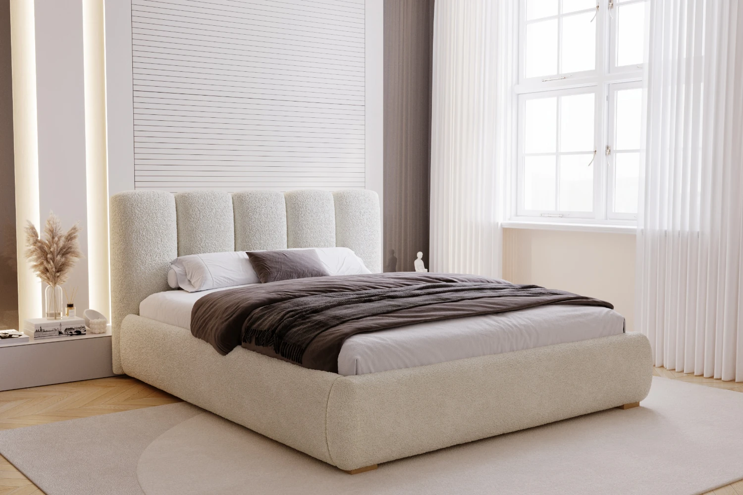 Łóżko tapicerowane Velluto z pojemnikiem i metalowym stelażem to model zaprojektowany z myślą o nowoczesnych, eleganckich i komfortowych sypialniach. Prosta, dopracowana bryła oraz miękka tapicerka sprawiają, że mebel prezentuje się wyjątkowo stylowo, a jednocześnie zapewnia wygodne warunki do codziennego wypoczynku. Tkanina Quelle 03 o strukturze bouclé w odcieniu kremowo-beżowym wprowadza do wnętrza ciepło, lekkość i ponadczasową estetykę.