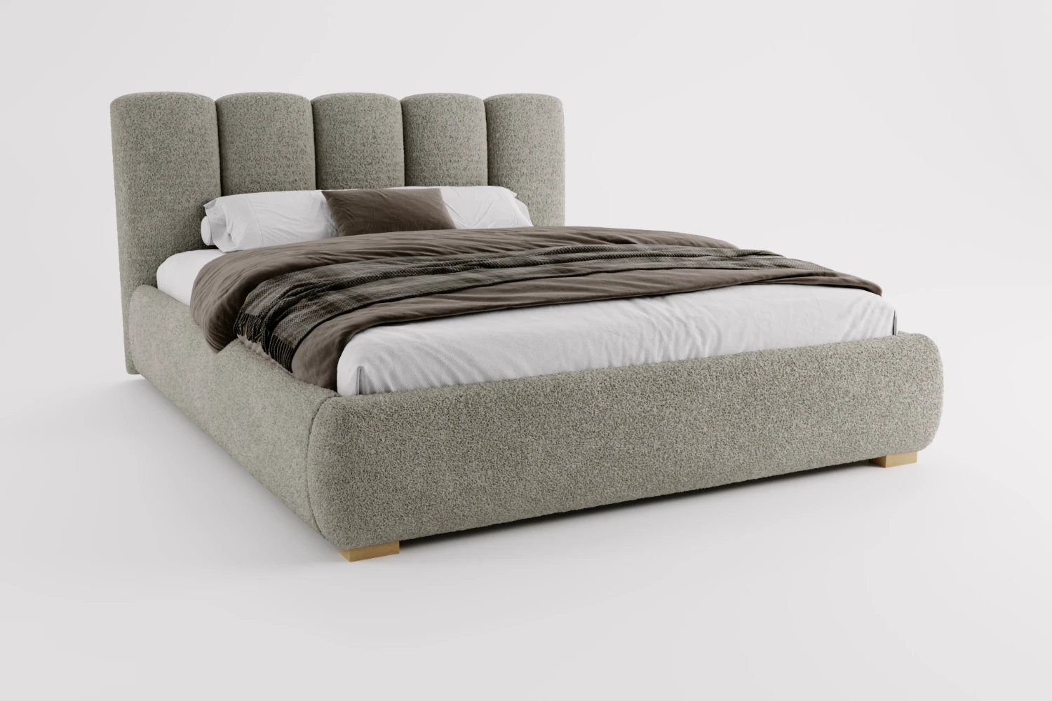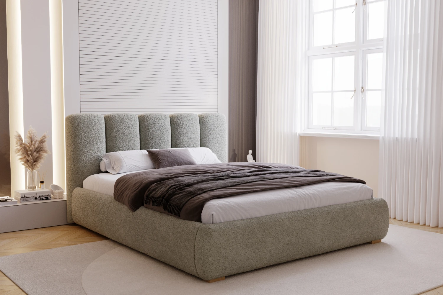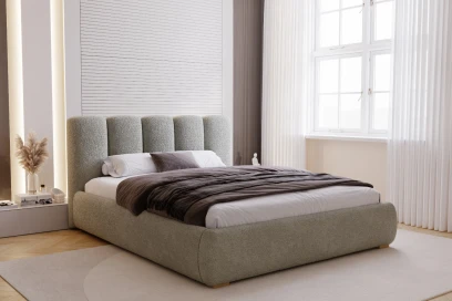 Łóżko tapicerowane Velluto z pojemnikiem i metalowym stelażem to model zaprojektowany z myślą o nowoczesnych, eleganckich i komfortowych sypialniach. Prosta, dopracowana bryła oraz miękka tapicerka sprawiają, że mebel prezentuje się wyjątkowo stylowo, a jednocześnie zapewnia wygodne warunki do codziennego wypoczynku. Tkanina Quelle 83 o strukturze bouclé w odcieniu szarości wprowadza do wnętrza ciepło, lekkość i ponadczasową estetykę.