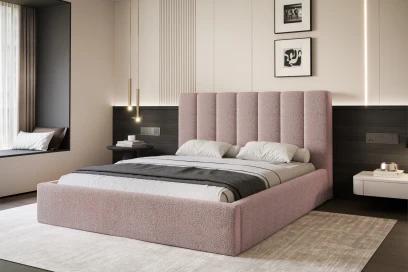 Stabilność konstrukcji zapewnia stelaż drewniany (32 listwy), który dobrze podpiera materac i sprzyja cyrkulacji powietrza. Wewnętrzna część łóżka została wykończona praktycznym materiałem (wigofil), a elementy skrzyni i podłogi wykonano z białej płyty - dzięki temu wnętrze pojemnika jest estetyczne i łatwe do utrzymania w czystości. To rozwiązanie docenisz zwłaszcza w mniejszych mieszkaniach, gdzie liczy się każdy centymetr przechowywania. Model Arco wyróżnia się wysokim, wygodnym zagłówkiem (ok. 110 cm), który pozwala komfortowo oprzeć plecy podczas czytania lub oglądania seriali. Tapicerka Abriamo 11 w odcieniu różu podkreśla przytulny charakter sypialni i dobrze komponuje się zarówno z jasnymi, jak i ciemniejszymi dodatkami. Łóżko jest dostępne w popularnych szerokościach (120/140/160/180 cm).
