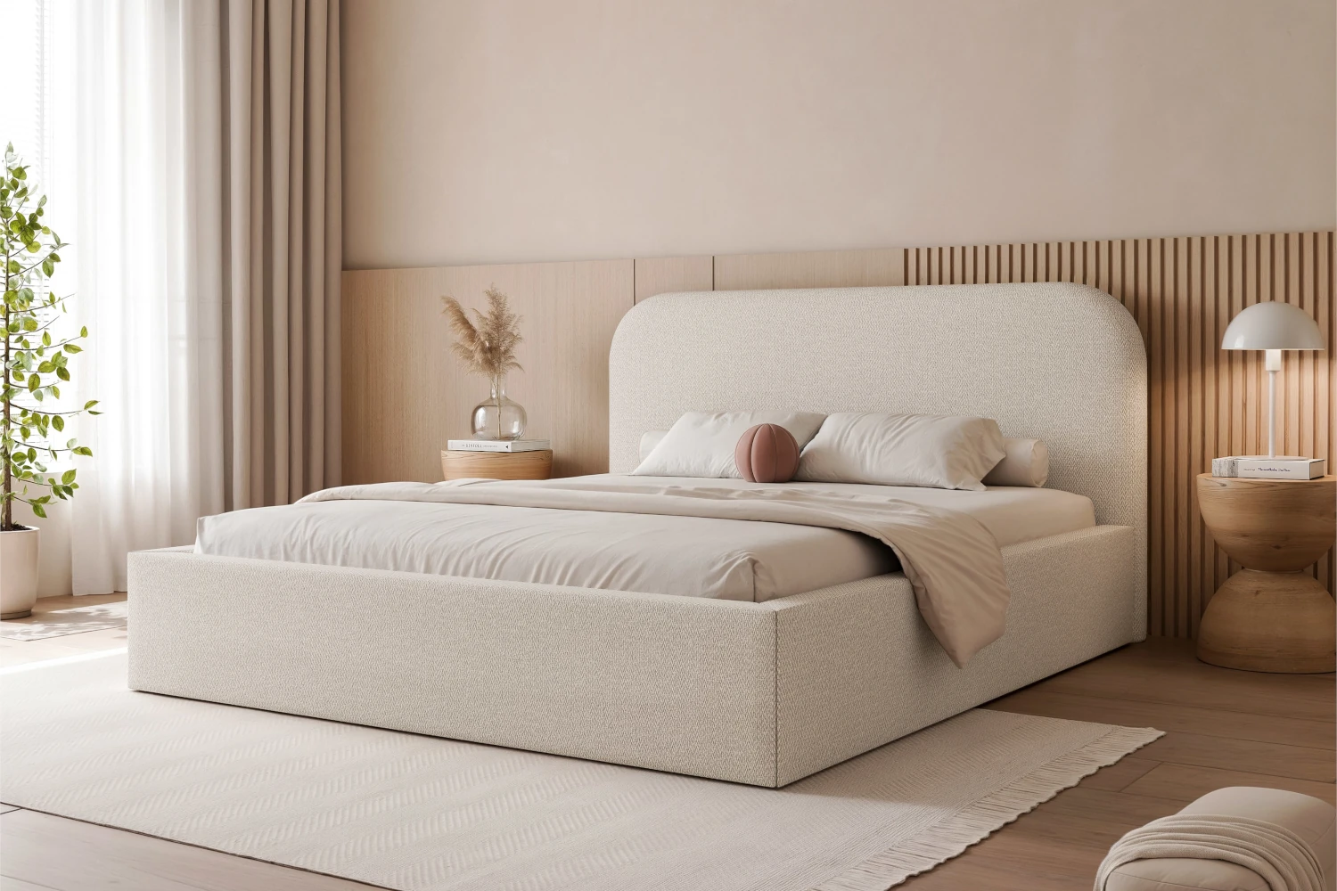 Łóżko tapicerowane z pojemnikiem na pościel Lunaro to propozycja dla osób, które szukają eleganckiego i jednocześnie bardzo praktycznego łóżka do nowoczesnej sypialni. Wysokie, zaokrąglone wezgłowie otula strefę wypoczynku i tworzy przytulne tło dla poduszek oraz dekoracyjnych tekstyliów, a miękka tkanina pięknie podkreśla charakter wnętrz urządzonych w stylu minimalistycznym, boho czy modern classic.