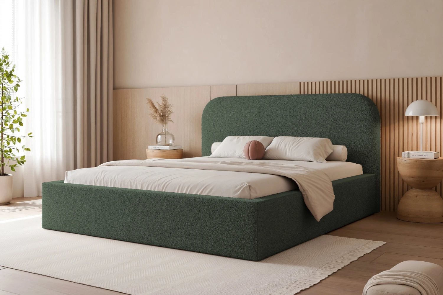 Model dostępny jest w kilku szerokościach, dzięki czemu łatwo dopasować łóżko do sypialni zarówno mniejszej, jak i przestronnego master bedroom. Zielony odcień świetnie łączy się z drewnem, bielą i czernią, stanowiąc uniwersalną bazę dla dodatków w dowolnych kolorach. To praktyczne łóżko z pojemnikiem na pościel, które łączy funkcjonalność, wygodę snu i ponadczasowy design.