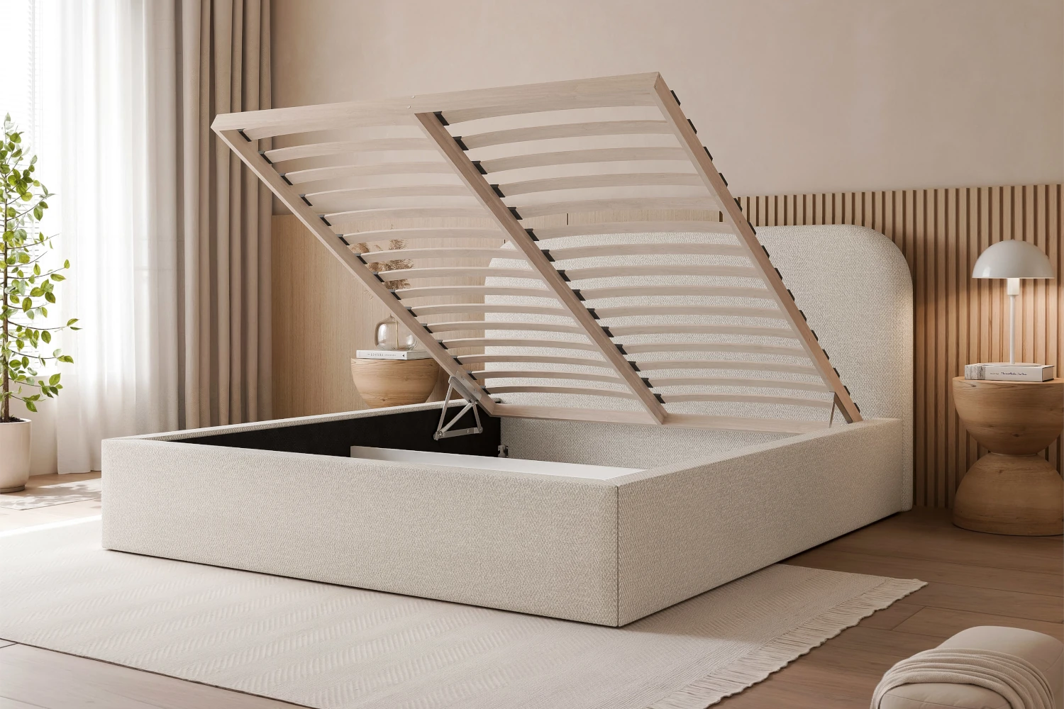 Korpus łóżka tworzy jednolitą, tapicerowaną ramę, która prezentuje się lekko, a jednocześnie jest stabilna i odporna na codzienne użytkowanie. Wnętrze skrzyni kryje obszerny pojemnik na pościel, idealny do przechowywania kołder, poduszek czy sezonowych tekstyliów. Dzięki podnoszonemu stelażowi dostęp do schowka jest wygodny, a powierzchnia pod materacem zostaje maksymalnie wykorzystana.