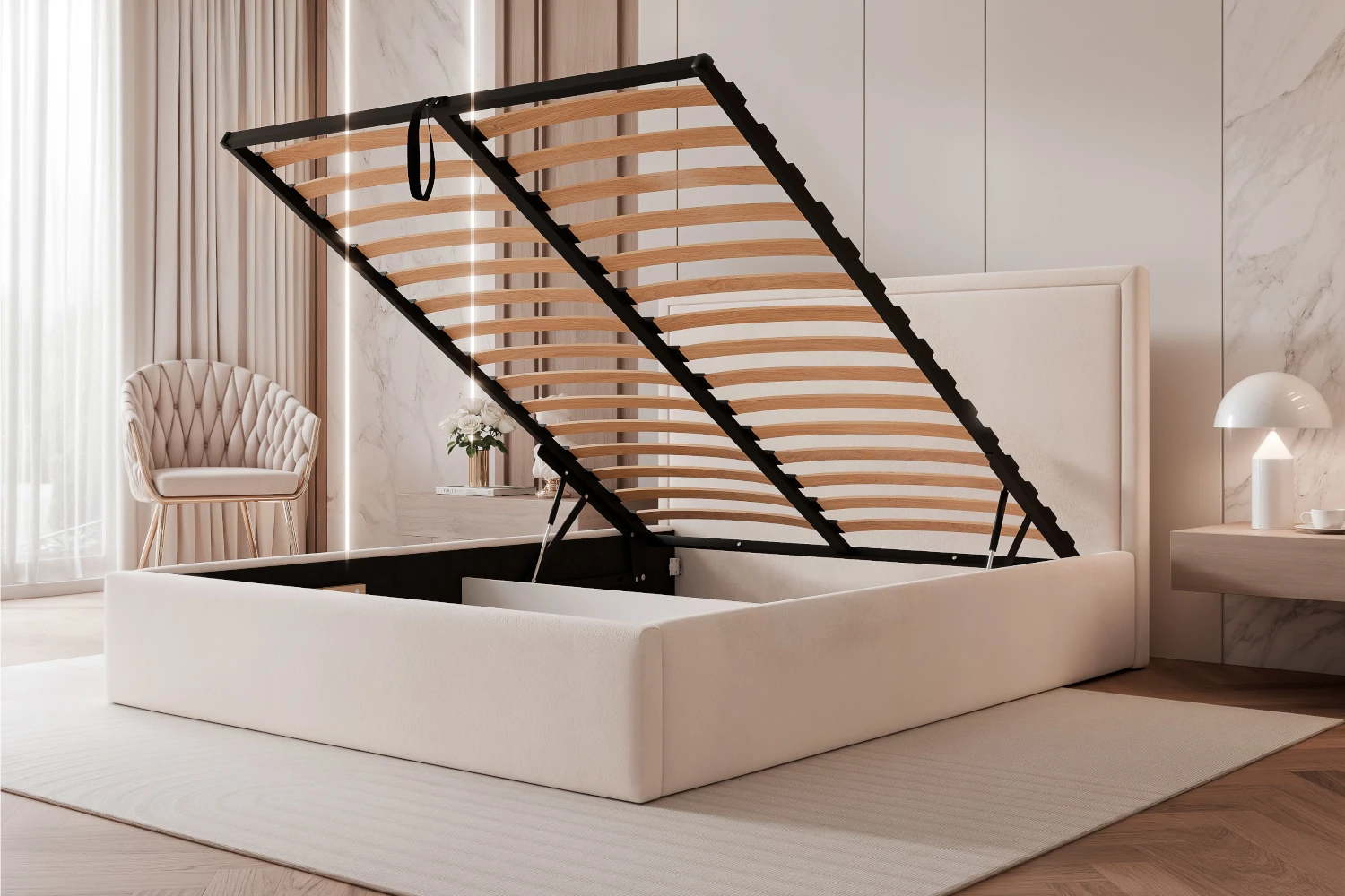 Największą zaletą modelu jest pojemne miejsce do przechowywania - pojemnik na pościel pod całą powierzchnią łóżka ułatwia organizację koców, kołder czy sezonowych tekstyliów. Dzięki temu zyskujesz dodatkową przestrzeń bez dokładania kolejnych mebli. Konstrukcję uzupełnia drewniany stelaż, który składa się z 32 listew i zapewnia stabilne podparcie materaca oraz komfort użytkowania przez długi czas. Łóżko tapicerowane Savio dostępne jest w kilku wariantach szerokości, co ułatwia dopasowanie do Twojej sypialni: pod rozmiary 120/140/160/180/200 cm. Długość łóżka to ok. 226 cm, a wysokość zagłówka ok. 110 cm, co zapewnia wygodne oparcie podczas czytania lub oglądania. Boki mają ok. 30 cm wysokości, grubość boczków ok. 7,5 cm, a grubość zagłówka ok. 10 cm - proporcje te podkreślają solidny, dopracowany wygląd mebla.