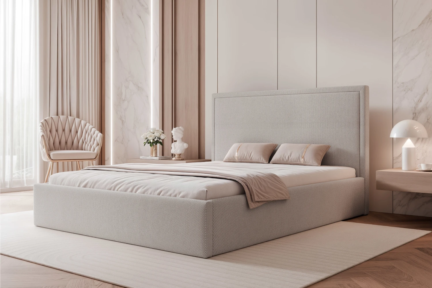 To łóżko z pojemnikiem na pościel sprawdzi się zarówno w mniejszych sypialniach, gdzie liczy się każdy schowek, jak i w większych wnętrzach, w których chcesz postawić na efektowną, tapicerowaną bryłę.