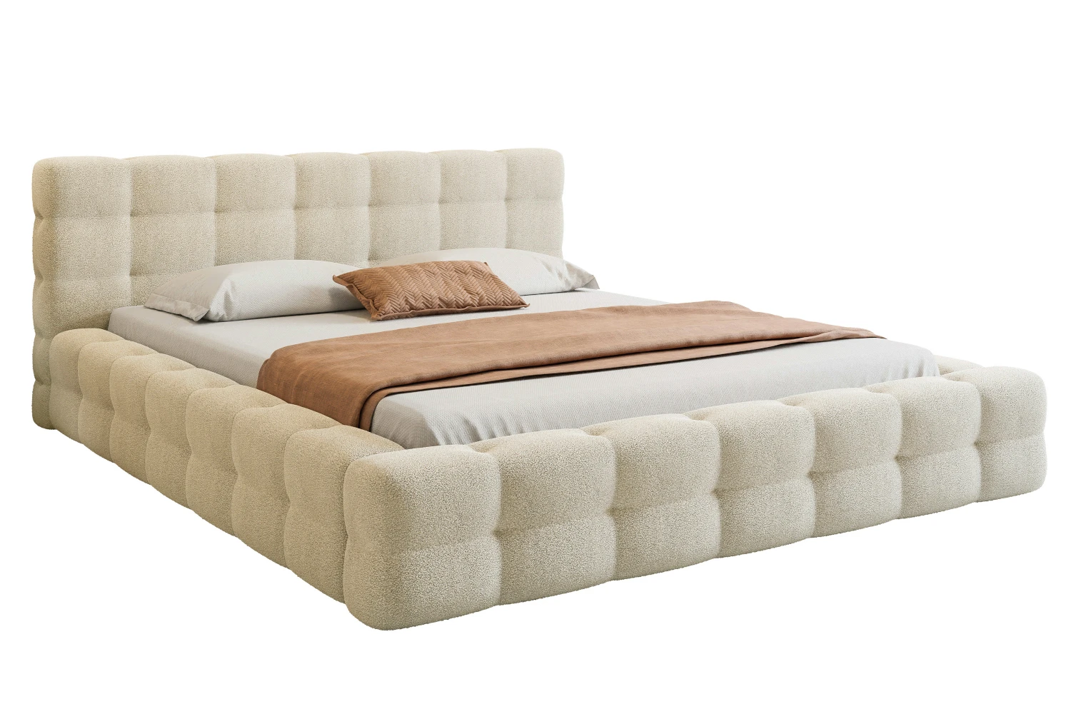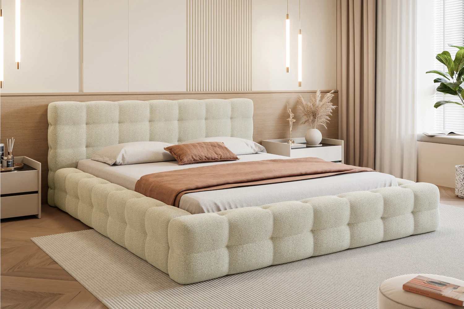 Jeśli szukasz mebla, który łączy w sobie wyjątkową przytulność z nowoczesną formą, łóżko tapicerowane Amiri będzie doskonałym wyborem. Jego charakterystyczną cechą są wyjątkowo grube boki o szerokości 15 cm oraz charakterystyczne pikowania na całej bryle, które nadają mu miękki, „chmurkowy” wygląd. Wykończenie z tkaniny Bubble 02 w kolorze jasny beż sprawia, że mebel prezentuje się niezwykle lekko i elegancko, wprowadzając do sypialni spokój i harmonię.