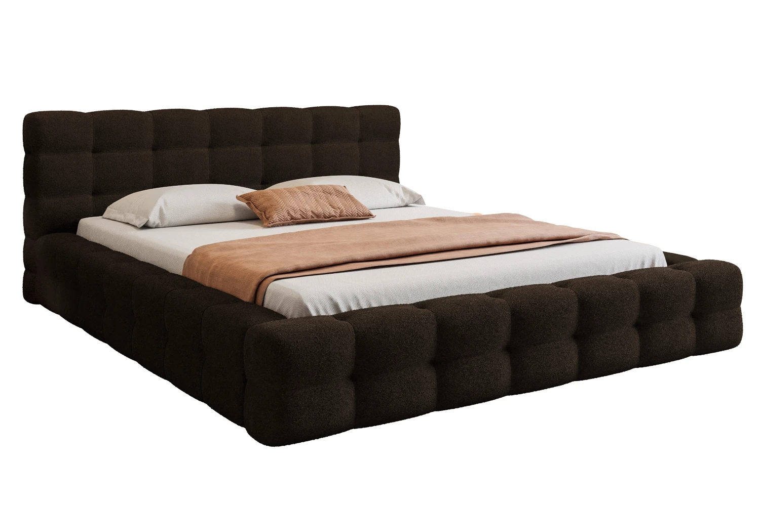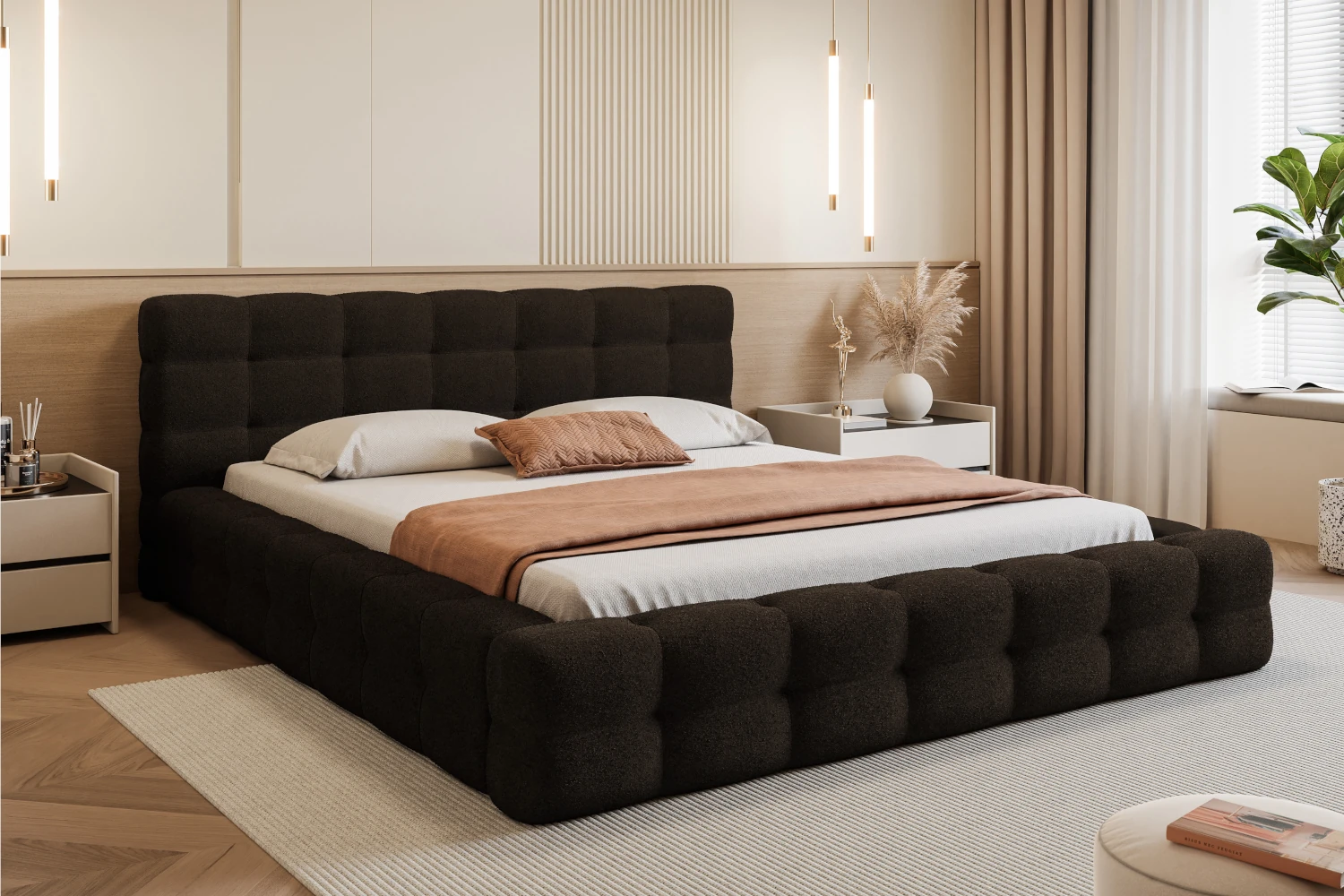 Jeśli szukasz mebla, który łączy w sobie wyjątkową przytulność z nowoczesną formą, łóżko tapicerowane Amiri będzie doskonałym wyborem. Jego charakterystyczną cechą są wyjątkowo grube boki o szerokości 15 cm oraz charakterystyczne pikowania na całej bryle, które nadają mu miękki, „chmurkowy” wygląd. Wykończenie z tkaniny Legend 9 w kolorze czarnym sprawia, że mebel prezentuje się niezwykle lekko i elegancko, wprowadzając do sypialni spokój i harmonię.