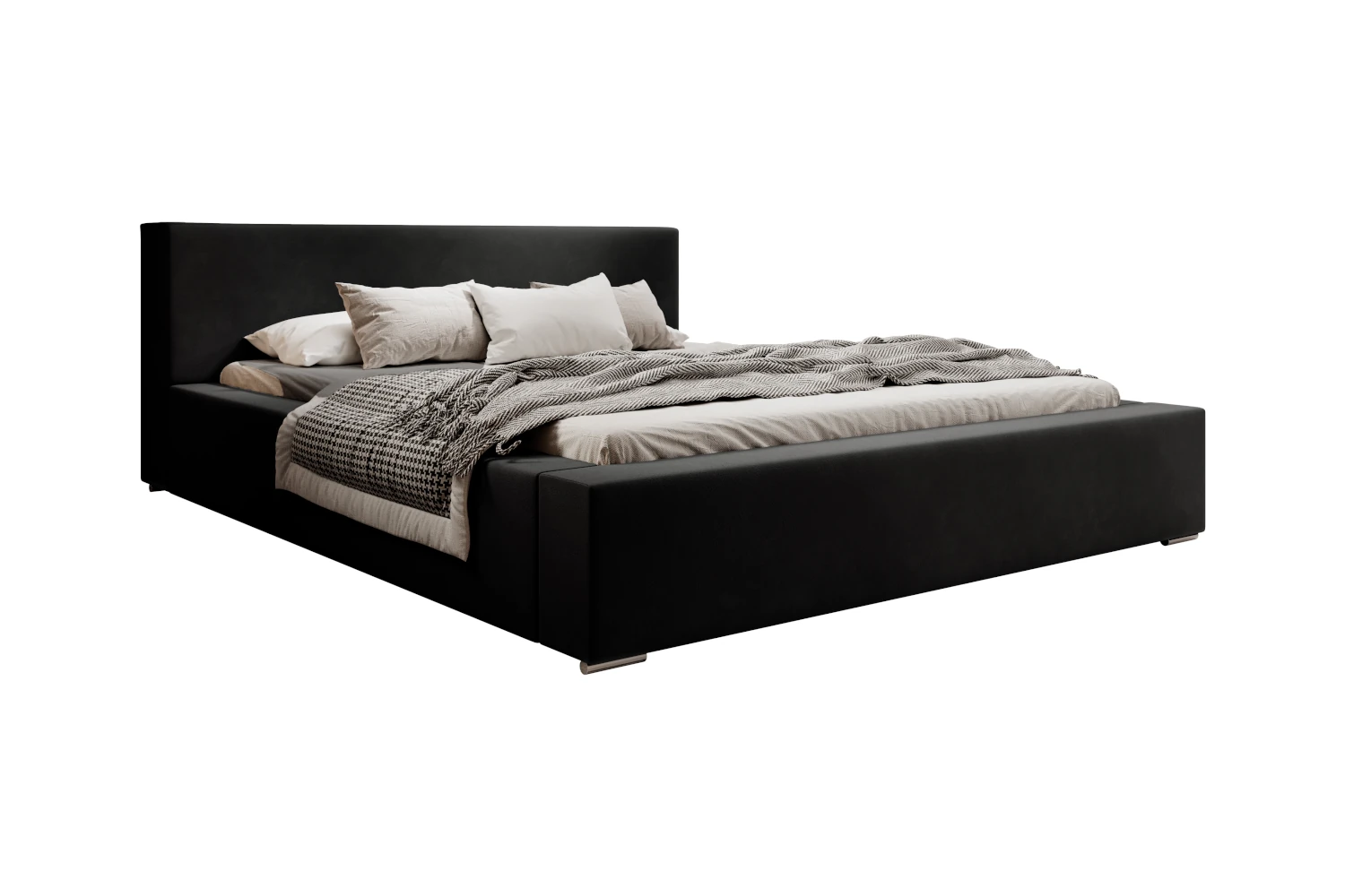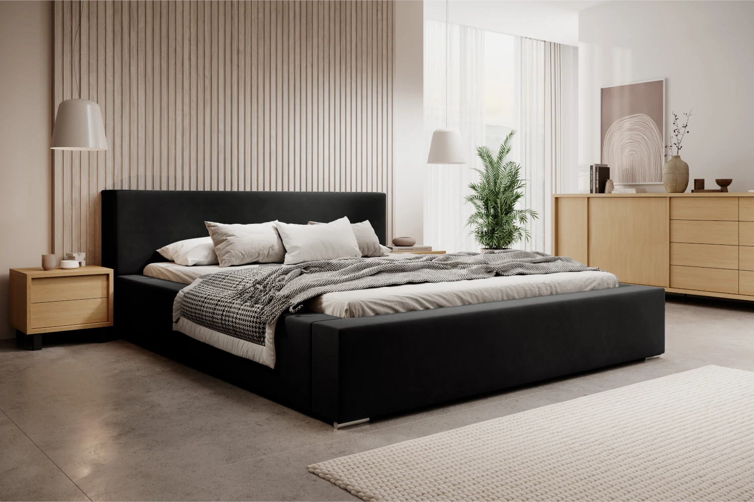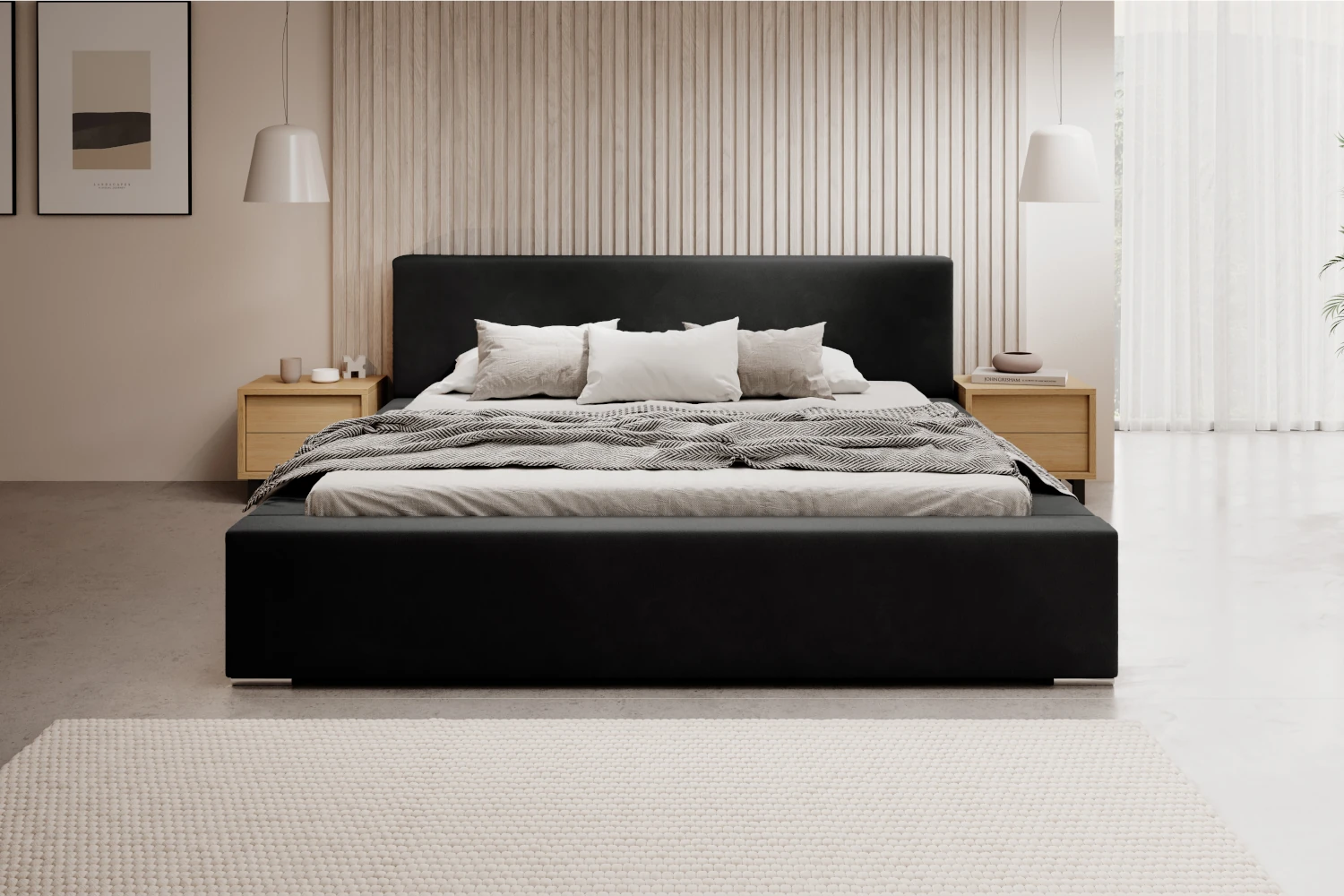 Łóżko tapicerowane z pojemnikiem Calvero to propozycja dla osób, które szukają eleganckiego, a jednocześnie praktycznego wyposażenia sypialni. Prosta forma, niski zagłówek oraz szerokie boki o grubości ok. 15 cm doskonale wpisują się w nowoczesne aranżacje. Obicie z miękkiej tkaniny typu velvet w czarnym kolorze prezentuje się wyjątkowo szlachetnie i harmonijnie współgra z drewnem, betonem czy jasnymi dodatkami tekstylnymi.
