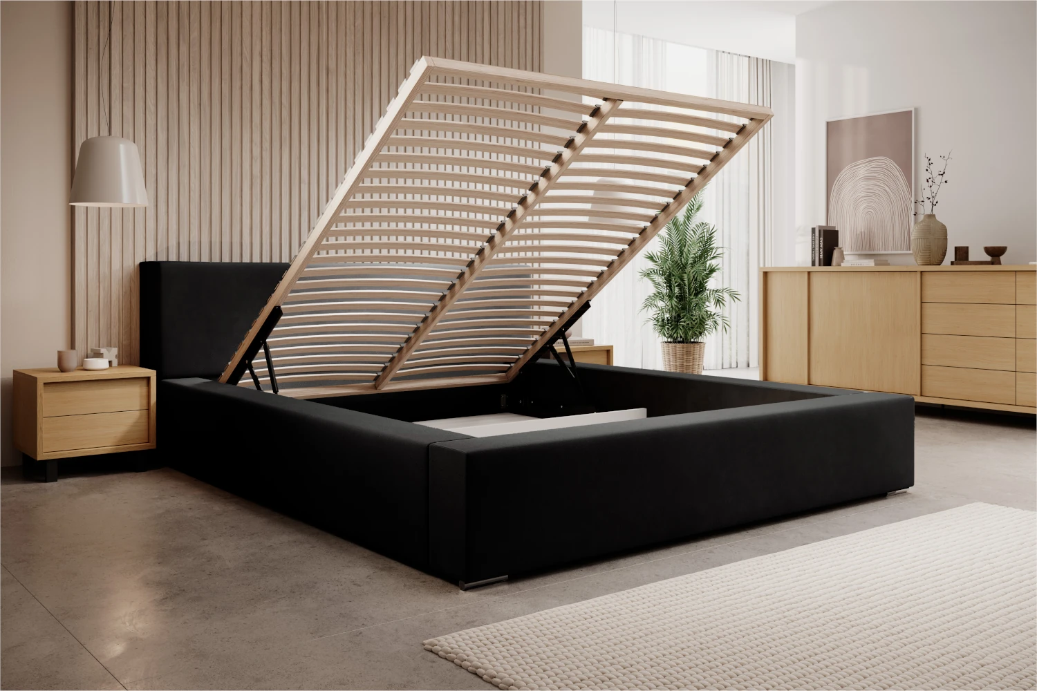 W konstrukcji wykorzystano przestronny pojemnik na pościel pod całą powierzchnią łóżka, do którego dostęp zapewnia wygodnie unoszony, drewniany stelaż. Wnętrze skrzyni wykończone jest jasną płytą i wigofilem, co ułatwia utrzymanie czystości i zwiększa trwałość mebla. Stabilna podstawa oraz solidne materiały sprawiają, że łóżko sprawdzi się zarówno w małej sypialni w bloku, jak i w przestronnym apartamencie.
