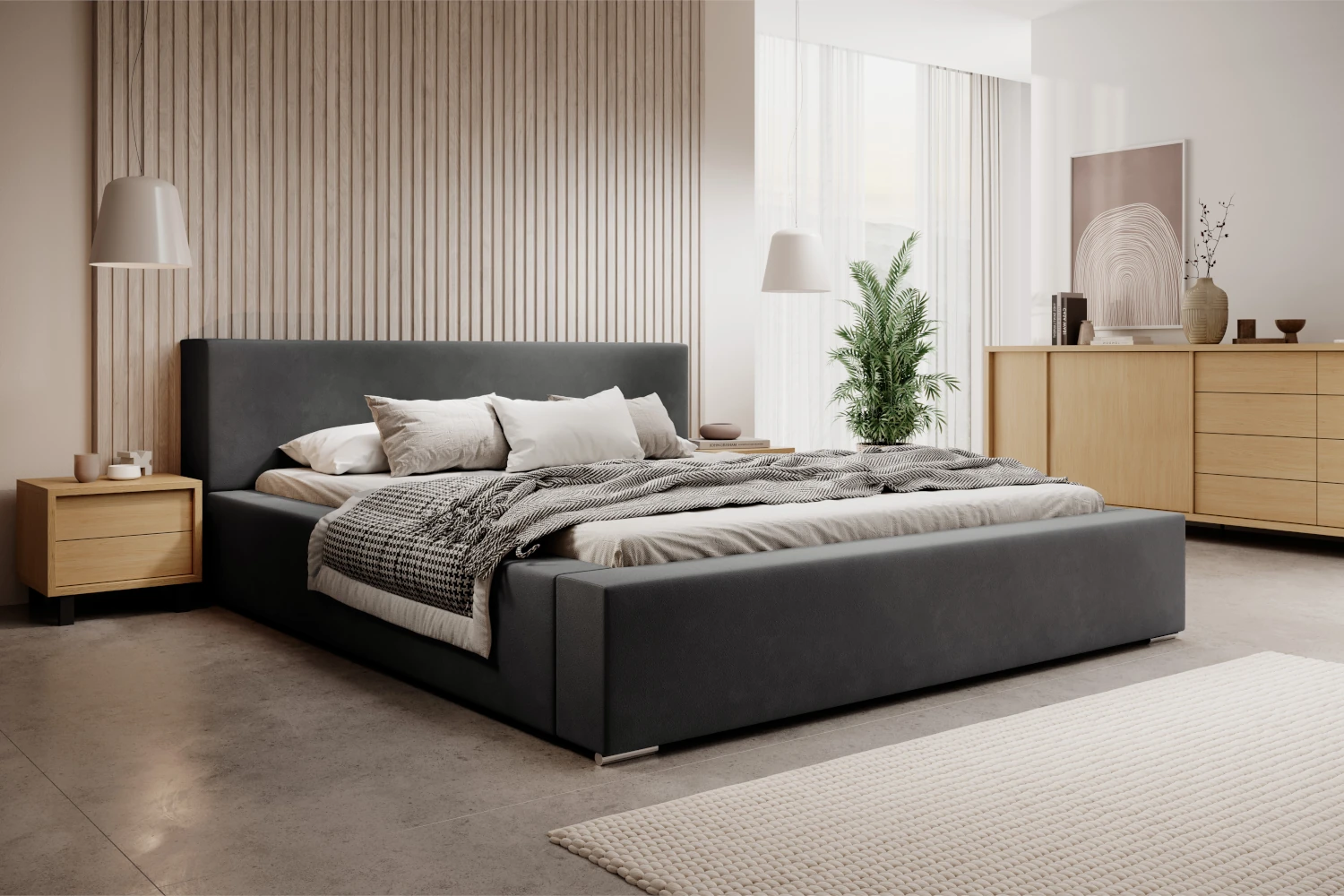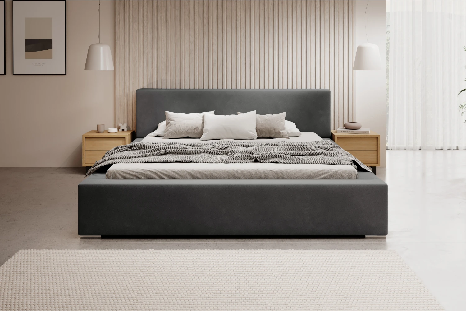 Łóżko tapicerowane z pojemnikiem Calvero to propozycja dla osób, które szukają eleganckiego, a jednocześnie praktycznego wyposażenia sypialni. Prosta forma, niski zagłówek oraz szerokie boki o grubości ok. 15 cm doskonale wpisują się w nowoczesne aranżacje. Obicie z miękkiej tkaniny typu velvet w odcieniu grafitowym prezentuje się wyjątkowo szlachetnie i harmonijnie współgra z drewnem, betonem czy jasnymi dodatkami tekstylnymi.