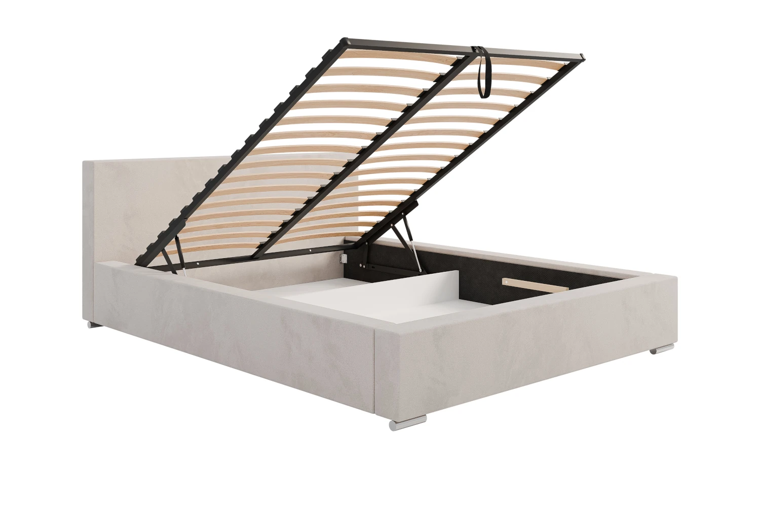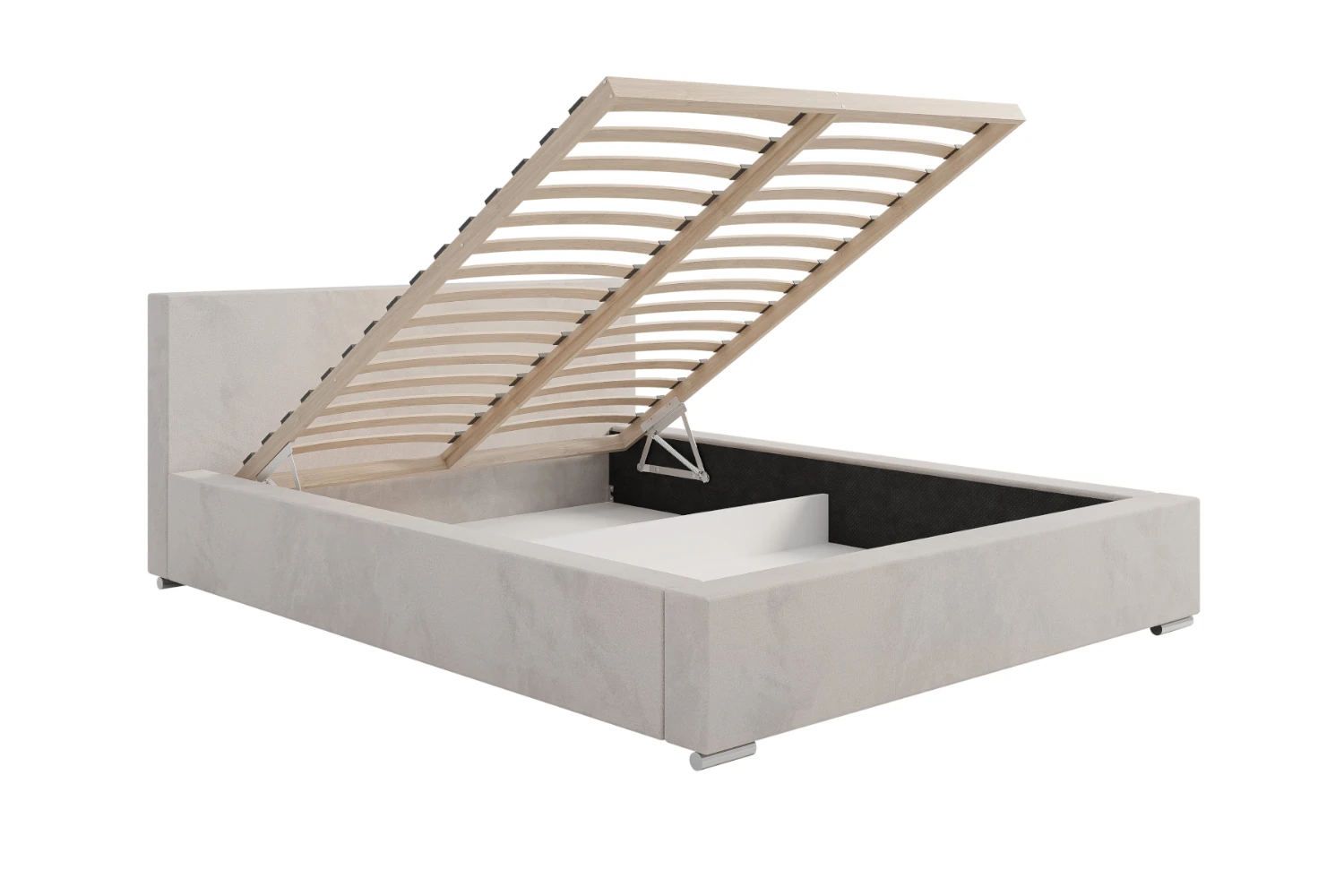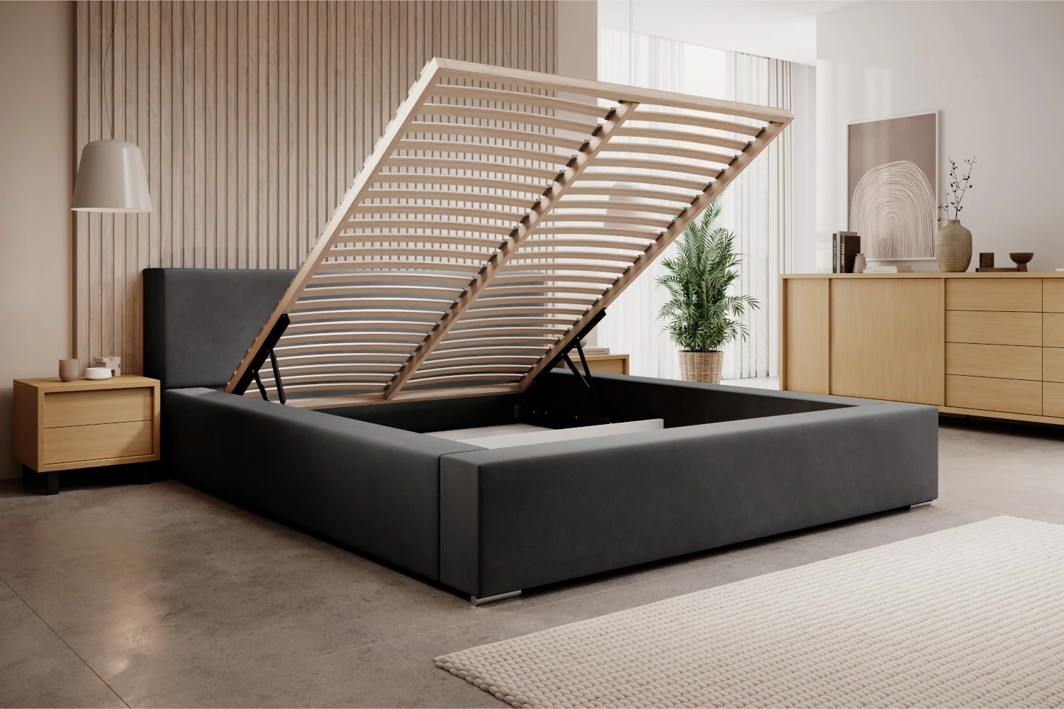W konstrukcji wykorzystano przestronny pojemnik na pościel pod całą powierzchnią łóżka, do którego dostęp zapewnia wygodnie unoszony, drewniany stelaż. Wnętrze skrzyni wykończone jest jasną płytą i wigofilem, co ułatwia utrzymanie czystości i zwiększa trwałość mebla. Stabilna podstawa oraz solidne materiały sprawiają, że łóżko sprawdzi się zarówno w małej sypialni w bloku, jak i w przestronnym apartamencie.