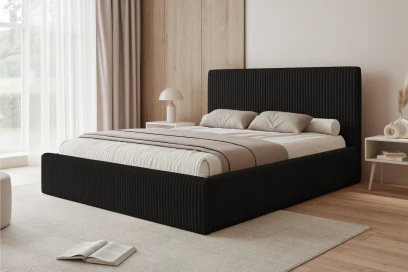 Łóżko tapicerowane Luxo to nowoczesne łóżko do sypialni z pojemnikiem na pościel, które łączy elegancki wygląd z praktycznym przechowywaniem. Model posiada drewniany stelaż i wysoki, wygodny zagłówek. Tapicerka w kolorze czarnym podkreśla charakter wnętrza, a pojemnik pod całą powierzchnią łóżka ułatwia organizację. Dostępne szerokości spania: 120/140/160/180/200 cm.