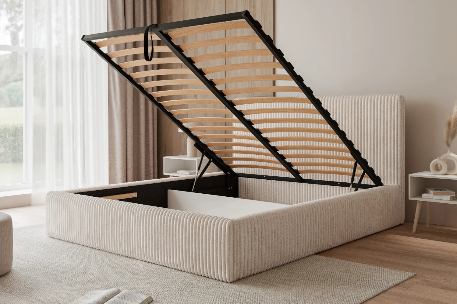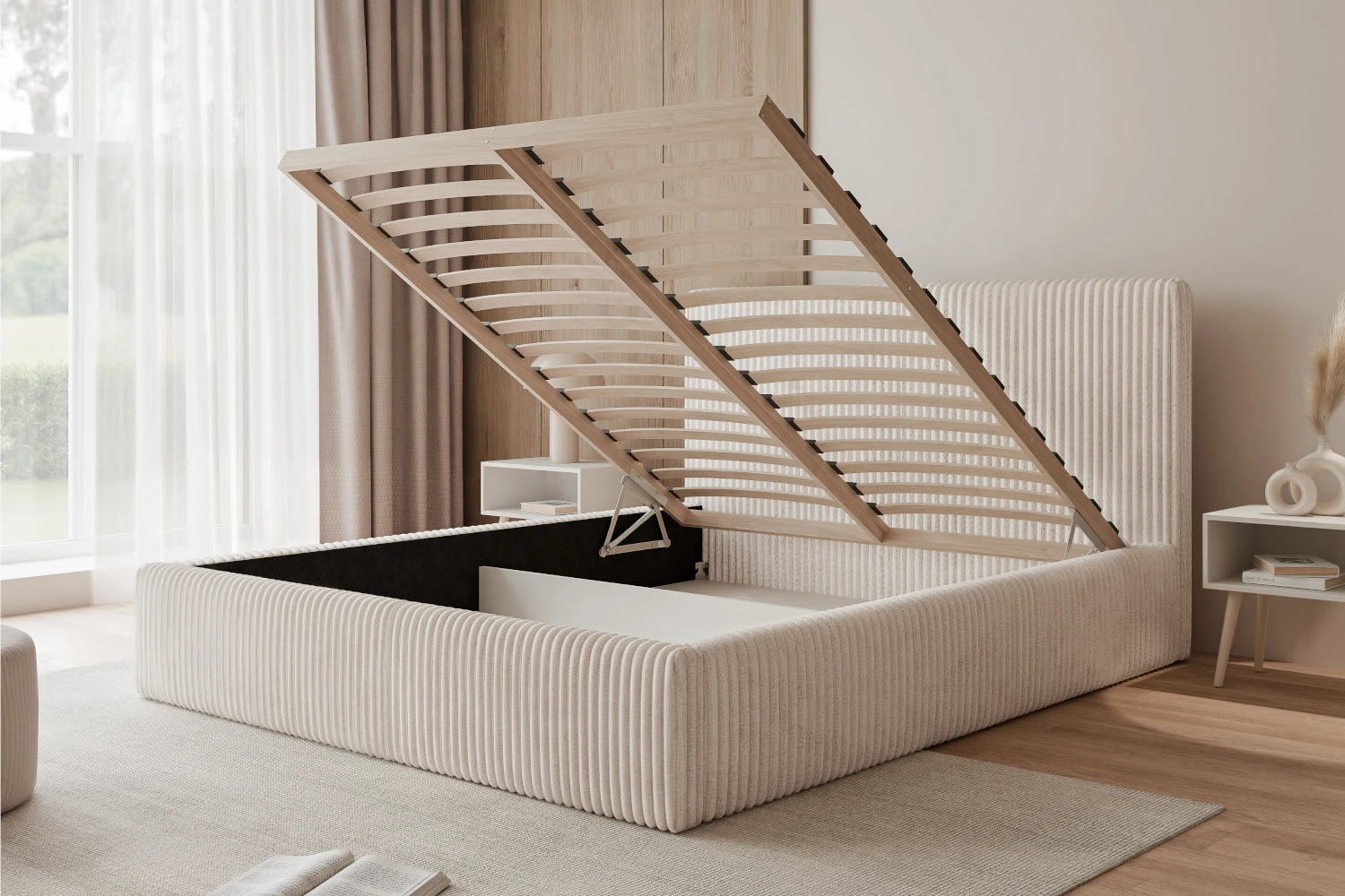 Łóżko tapicerowane z pojemnikiem na pościel i stelażem Luxo Waniliowy