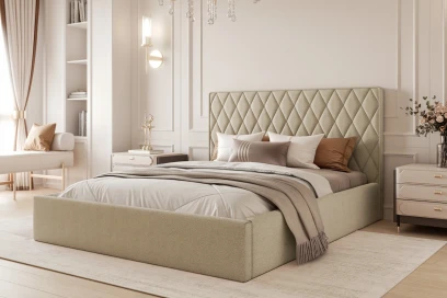 Jeśli szukasz mebla, który będzie jednocześnie ozdobą wnętrza i praktycznym rozwiązaniem na co dzień, łóżko tapicerowane Royal spełni te oczekiwania. To nowoczesne łóżko do sypialni z pojemnikiem na pościel, zaprojektowane z myślą o wygodnym odpoczynku oraz maksymalnym wykorzystaniu przestrzeni. Miękka, przyjemna w dotyku tkanina bouclé Melody 13 w kolorze beżowym świetnie wpisuje się w jasne, klasyczne i nowoczesne aranżacje.