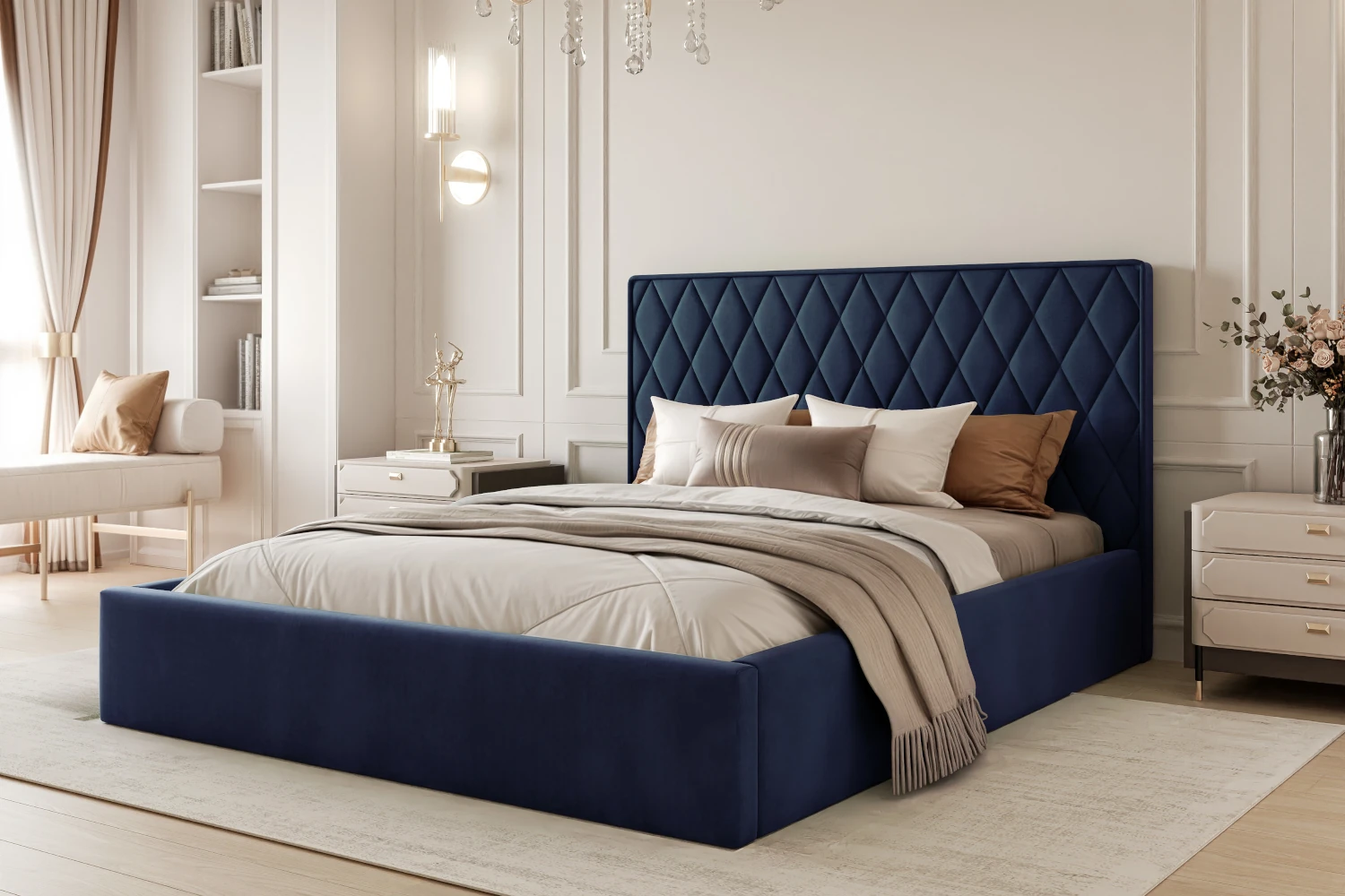 Jeśli szukasz mebla, który będzie jednocześnie ozdobą wnętrza i praktycznym rozwiązaniem na co dzień, łóżko tapicerowane Royal spełni te oczekiwania. To nowoczesne łóżko do sypialni z pojemnikiem na pościel, zaprojektowane z myślą o wygodnym odpoczynku oraz maksymalnym wykorzystaniu przestrzeni. Miękka, przyjemna w dotyku tkanina Magic Velvet 2216 w kolorze granatowym świetnie wpisuje się w jasne, klasyczne i nowoczesne aranżacje.