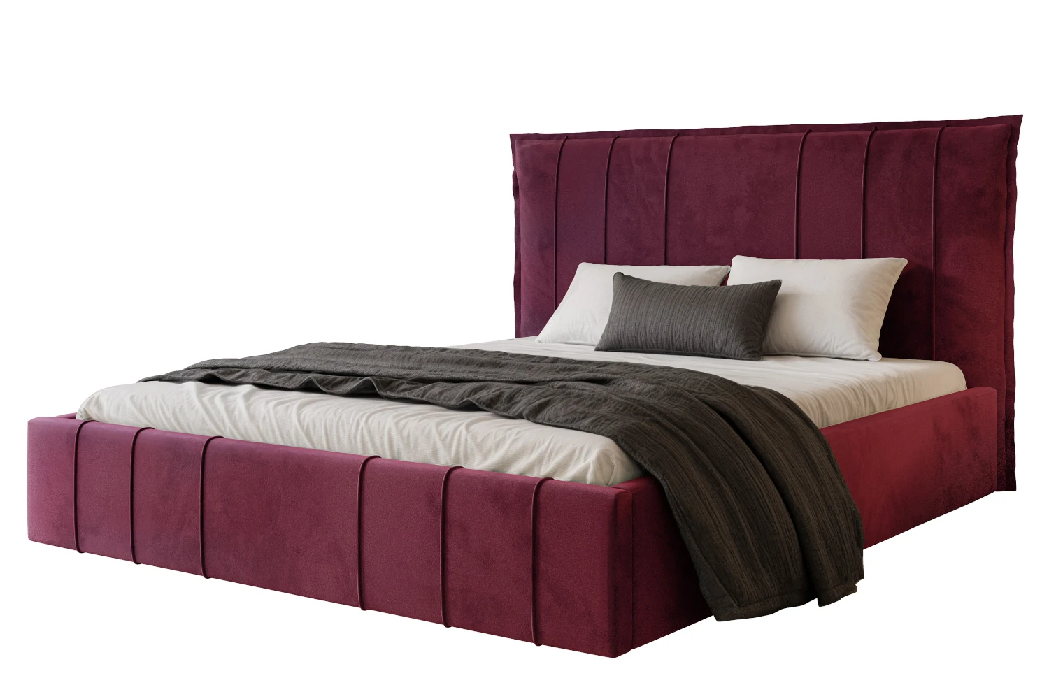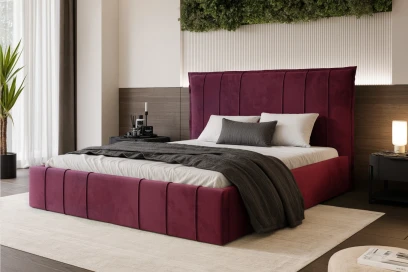 Jeśli szukasz mebla, który stanie się centralnym punktem Twojej sypialni, łóżko tapicerowane Vertico będzie doskonałym wyborem. Jego znakiem rozpoznawczym są nowoczesne, pionowe przeszycia na zagłówku i przodzie bryły, które nadają mu wyjątkowego, geometrycznego charakteru. Wykończenie z tkaniny Magic Velvet 2229 w kolorze bordowym sprawia, że mebel pięknie pracuje ze światłem, wprowadzając do wnętrza atmosferę przytulności i nowoczesnej elegancji.