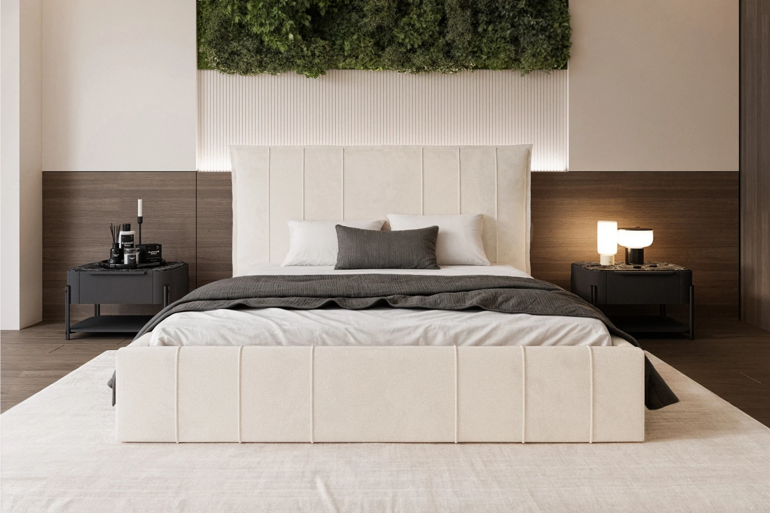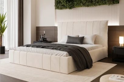 Jeśli szukasz mebla, który stanie się centralnym punktem Twojej sypialni, łóżko tapicerowane Vertico będzie doskonałym wyborem. Jego znakiem rozpoznawczym są nowoczesne, pionowe przeszycia na zagłówku i przodzie bryły, które nadają mu wyjątkowego, geometrycznego charakteru. Wykończenie z tkaniny Magic Velvet 2256 w kolorze ecru sprawia, że mebel pięknie pracuje ze światłem, wprowadzając do wnętrza atmosferę przytulności i nowoczesnej elegancji.