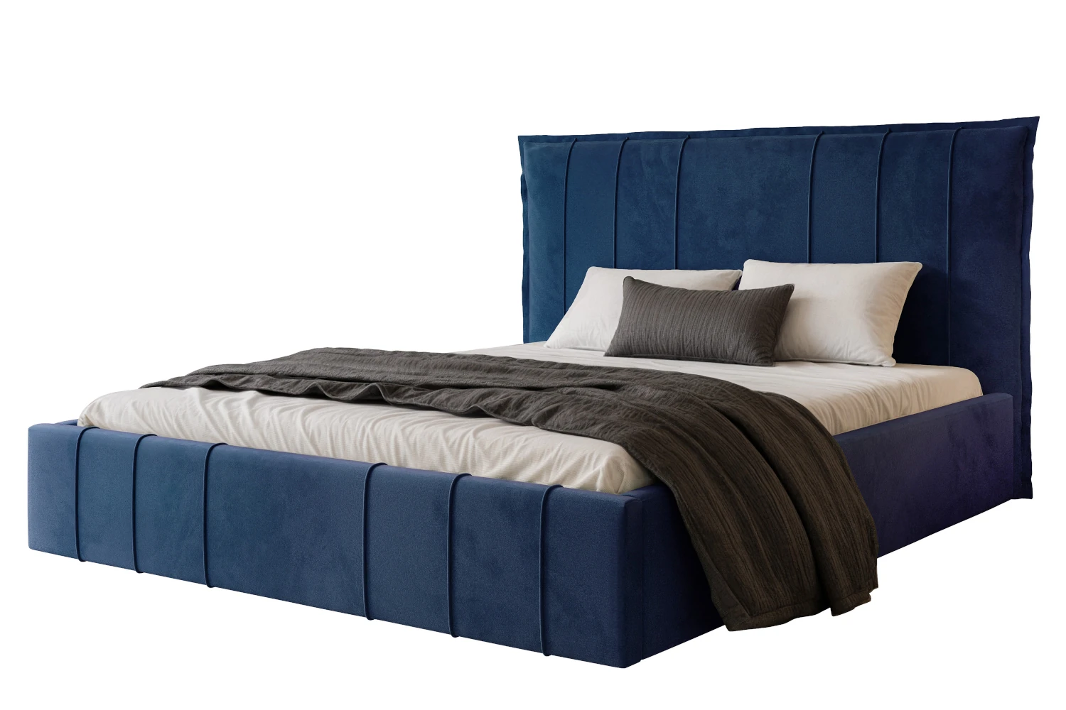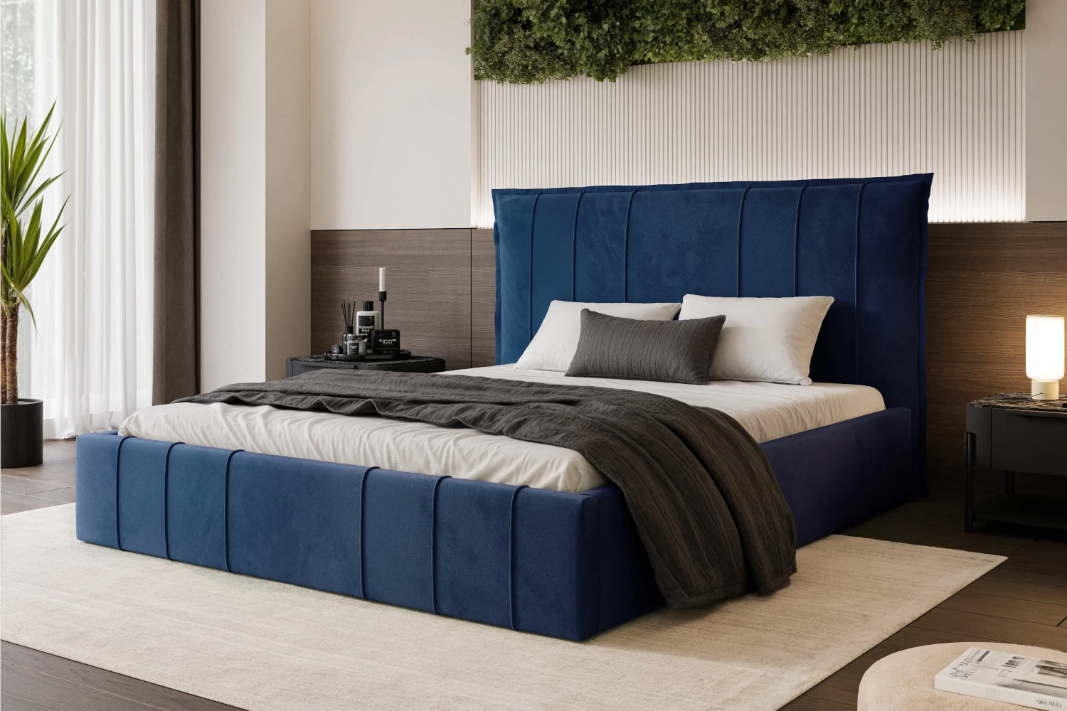 Jeśli szukasz mebla, który stanie się centralnym punktem Twojej sypialni, łóżko tapicerowane Vertico będzie doskonałym wyborem. Jego znakiem rozpoznawczym są nowoczesne, pionowe przeszycia na zagłówku i przodzie bryły, które nadają mu wyjątkowego, geometrycznego charakteru. Wykończenie z tkaniny Magic Velvet 2216 w kolorze granatowym sprawia, że mebel pięknie pracuje ze światłem, wprowadzając do wnętrza atmosferę przytulności i nowoczesnej elegancji.