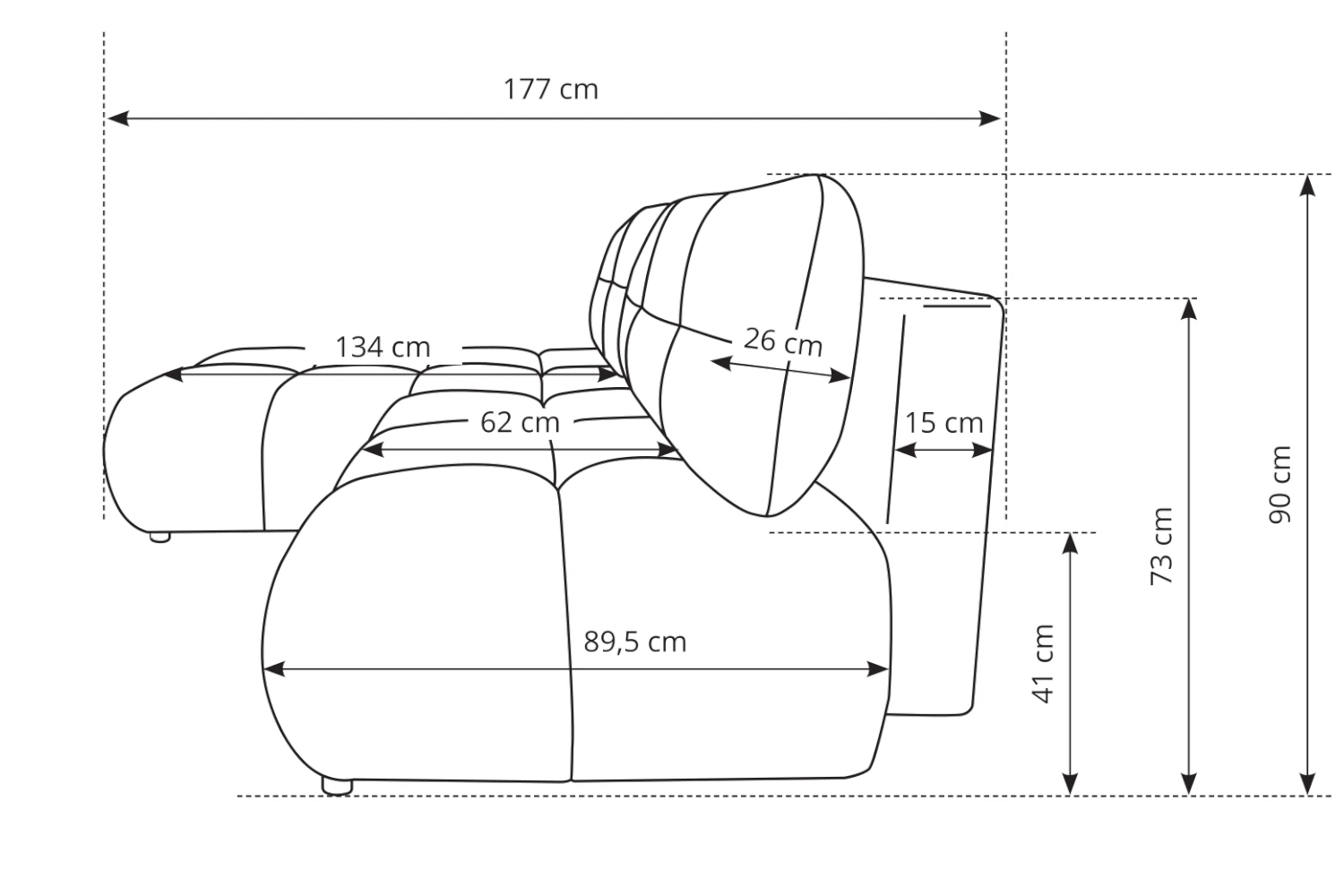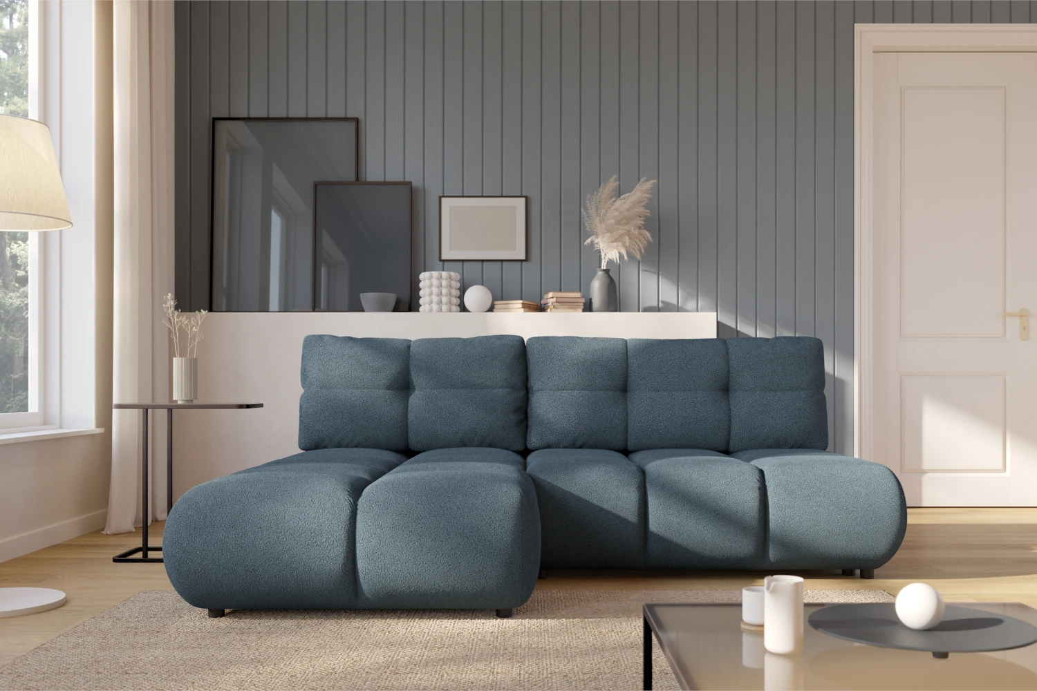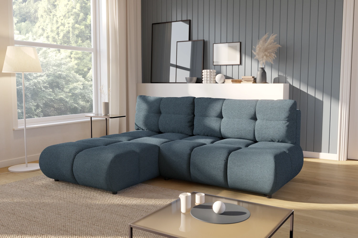 Narożnik Nami z funkcją spania i pojemnikiem na pościel dostępny jest w wersji lewostronnej i prawostronnej, dzięki czemu łatwo dopasujesz go do układu swojego salonu. To idealny wybór, jeśli zależy Ci na połączeniu wygody, modnego wyglądu i praktycznych rozwiązań w jednym meblu.