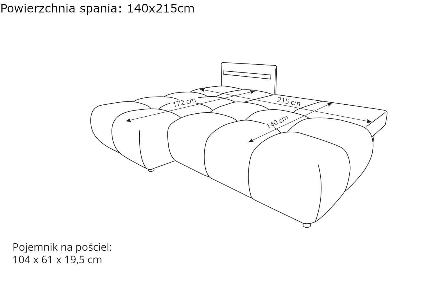 Dzięki wbudowanej funkcji spania narożnik Nami w prosty sposób zamienia się w wygodne łóżko o wymiarach 140x215 cm. To praktyczne rozwiązanie zarówno do codziennego snu, jak i okazjonalnego noclegu dla gości. Dodatkowym atutem jest pojemny pojemnik na pościel, w którym z łatwością przechowasz kołdry, poduszki czy koce, zachowując porządek w salonie.