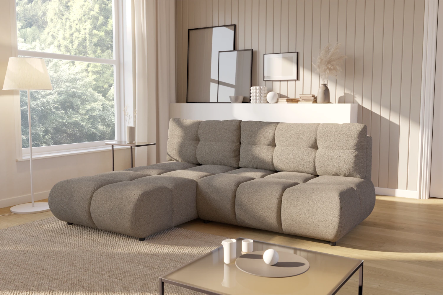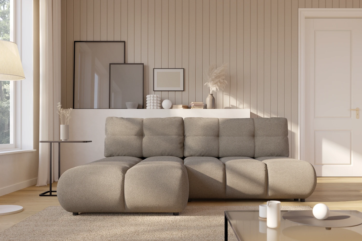 Narożnik z funkcją spania Nami to propozycja dla osób, które szukają komfortowego i efektownego mebla do salonu. Zaoblone kształty, głębokie pikowania i masywne siedziska tworzą wyjątkowo przytulną bryłę, która staje się centralnym punktem strefy wypoczynku. Narożnik doskonale pasuje do nowoczesnych, minimalistycznych i skandynawskich aranżacji.