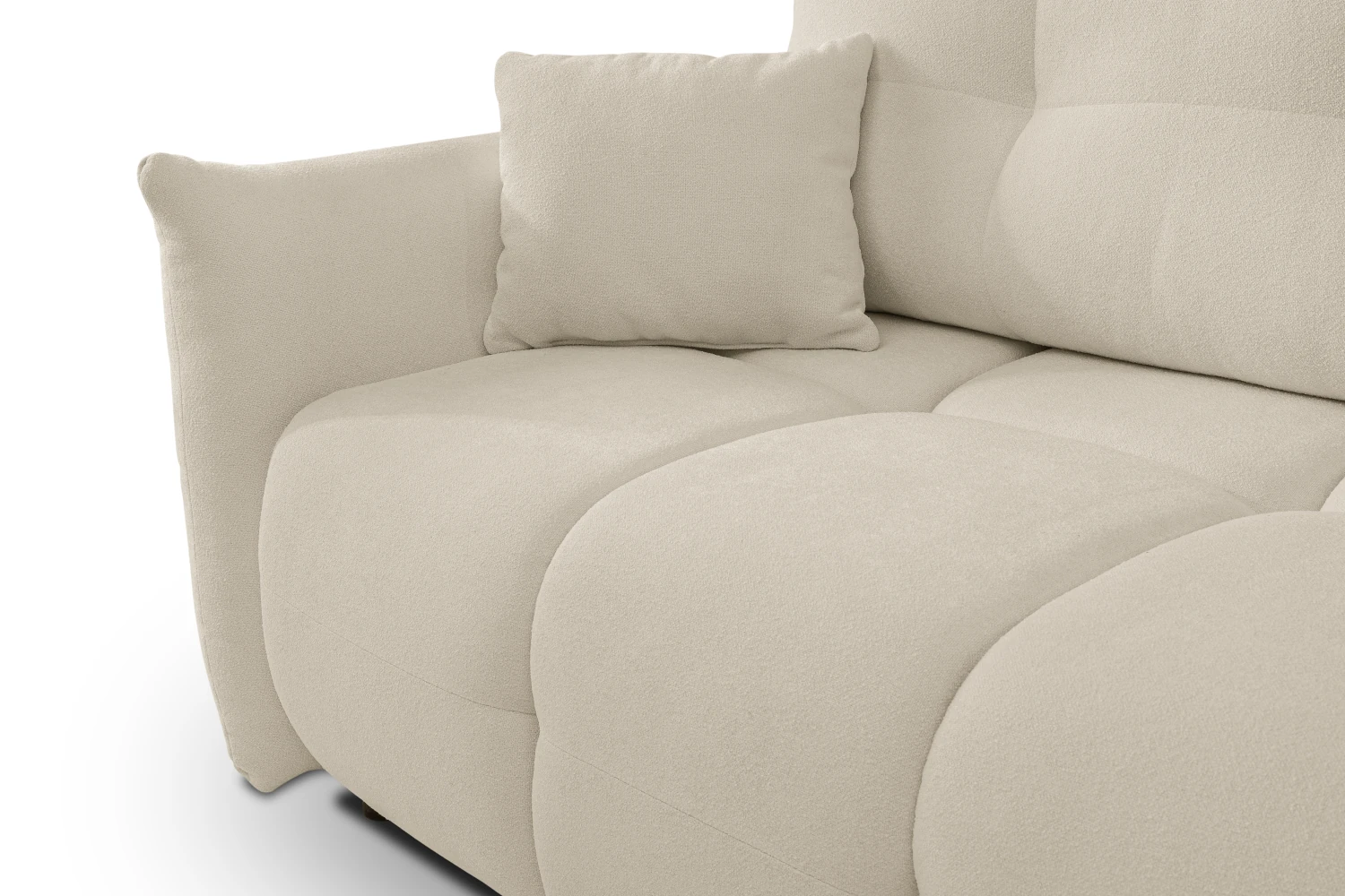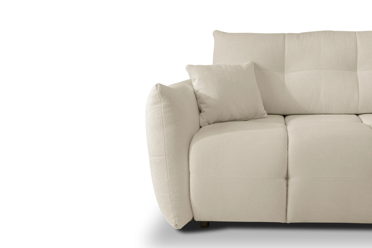 Narożnik Nubi L uniwersalny z funkcją spania i pojemnikiem to propozycja dla osób, które szukają wygodnego i jednocześnie efektownego mebla do nowoczesnego salonu. Charakterystyczne, miękko zaoblone siedziska z dekoracyjnym pikowaniem tworzą przytulną strefę relaksu, a wysokie oparcie z luźnymi poduchami zapewnia komfortowe podparcie pleców podczas oglądania telewizji lub czytania.
