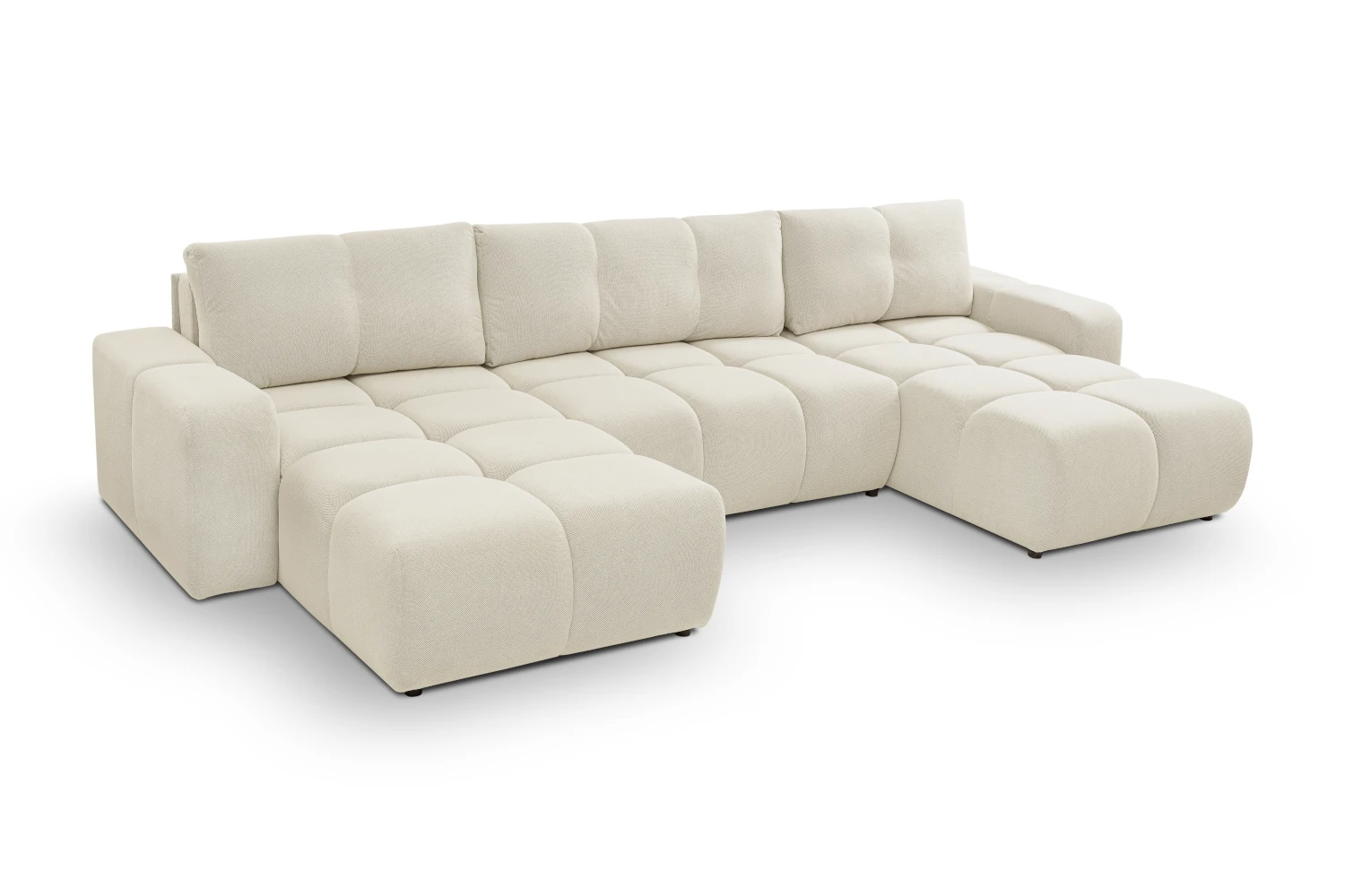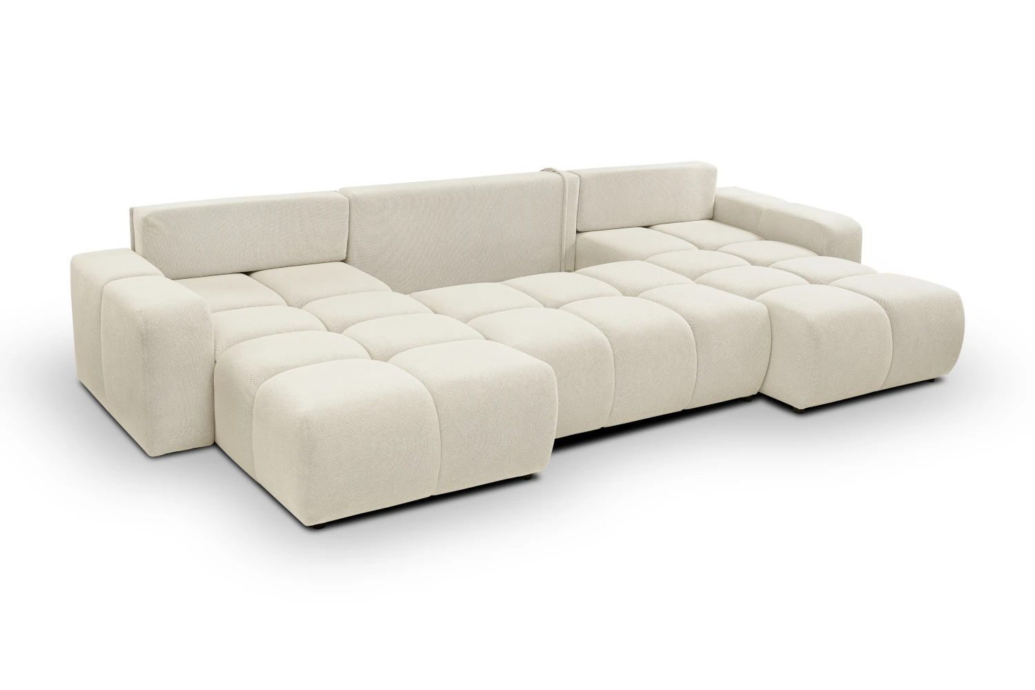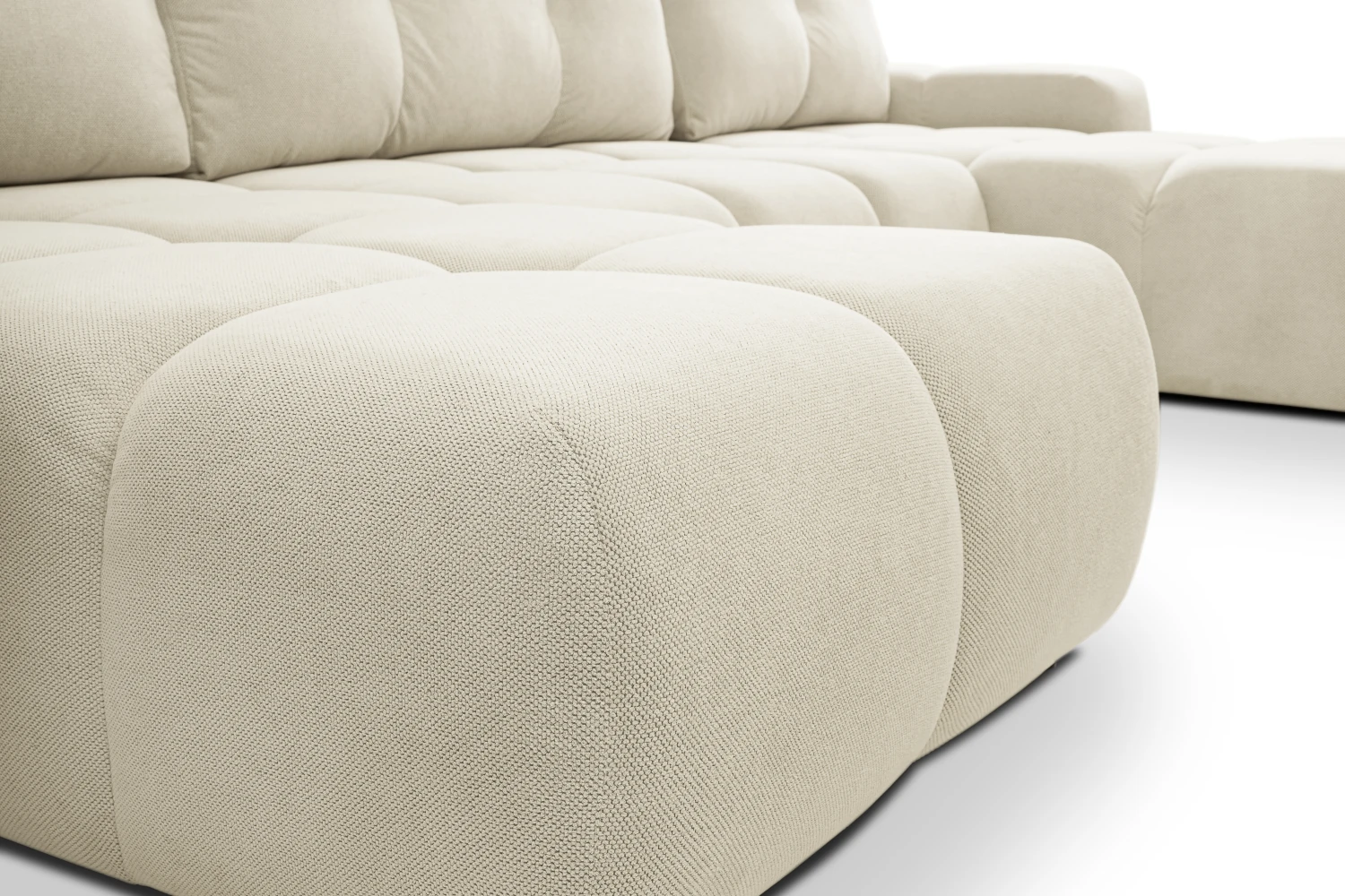 Narożnik U Mellow z funkcją spania i pojemnikiem na pościel to wyjątkowo komfortowy, modułowy mebel do nowoczesnego salonu. Obszerne, miękkie siedziska i luźne poduszki oparciowe zapewniają wygodę całej rodzinie, a duża powierzchnia spania 140x303 cm sprawia, że narożnik świetnie sprawdza się również jako łóżko dla gości.
