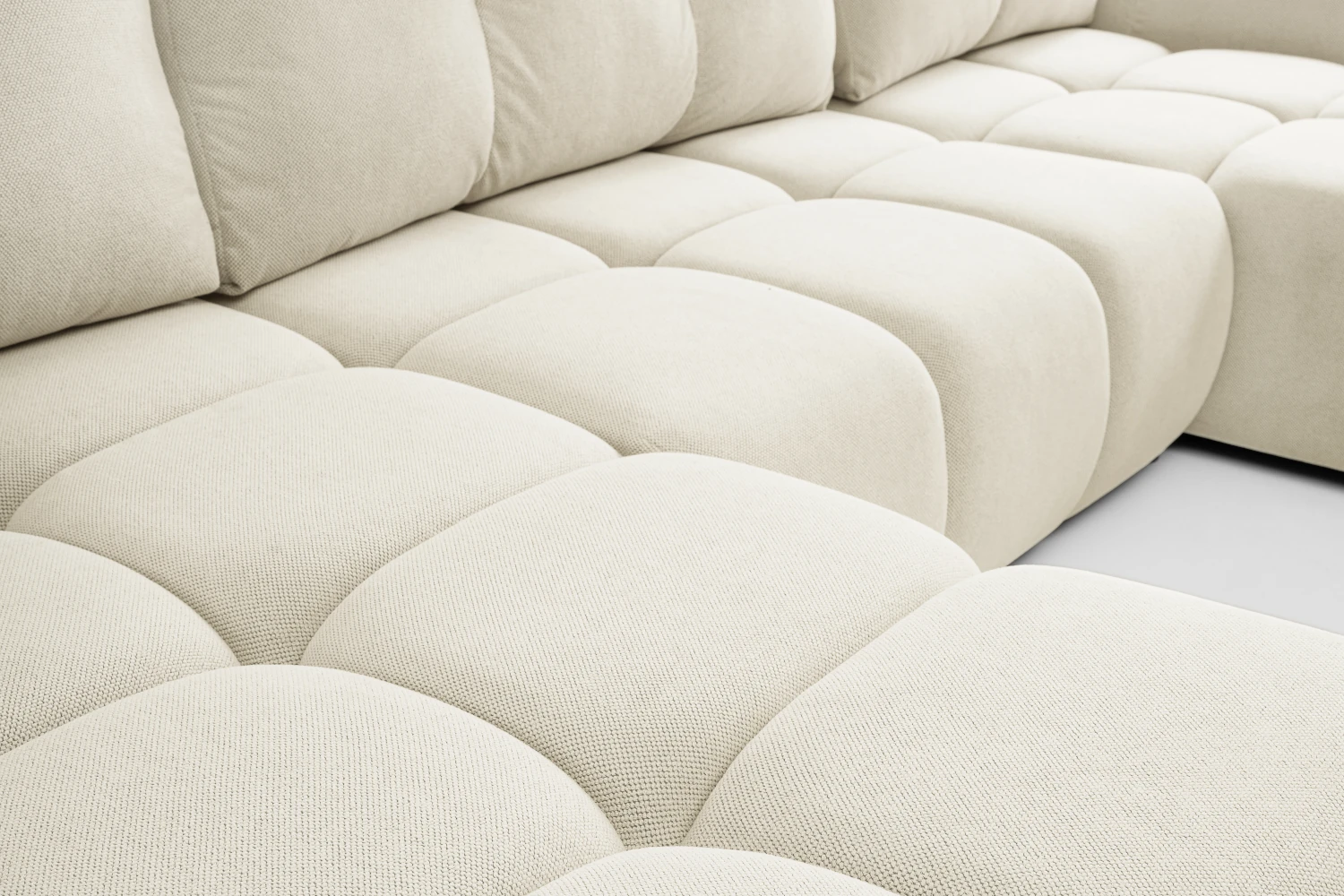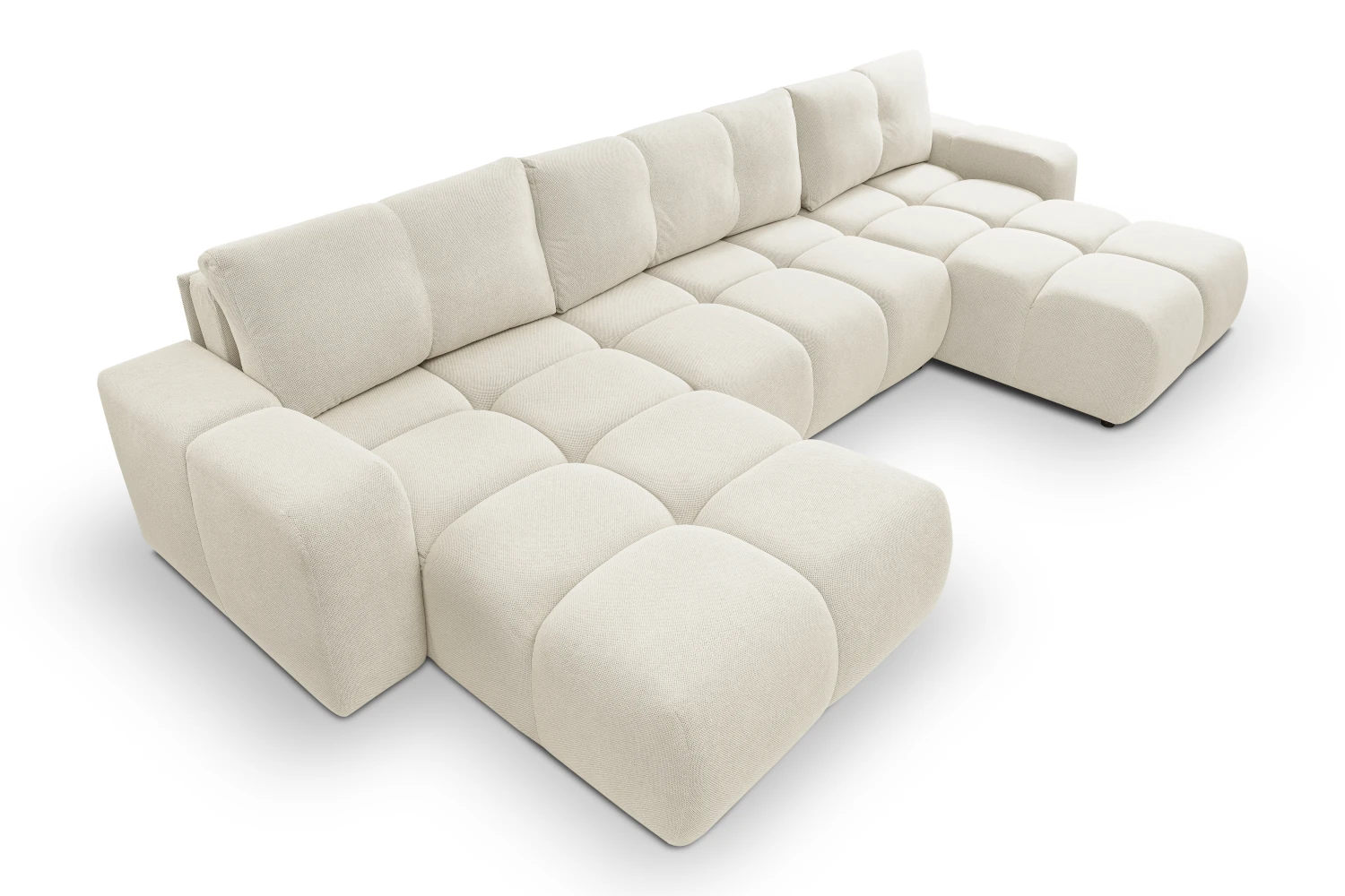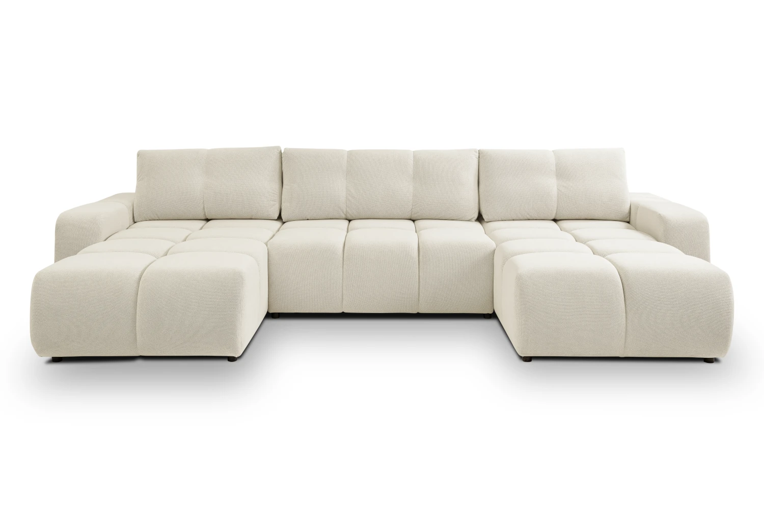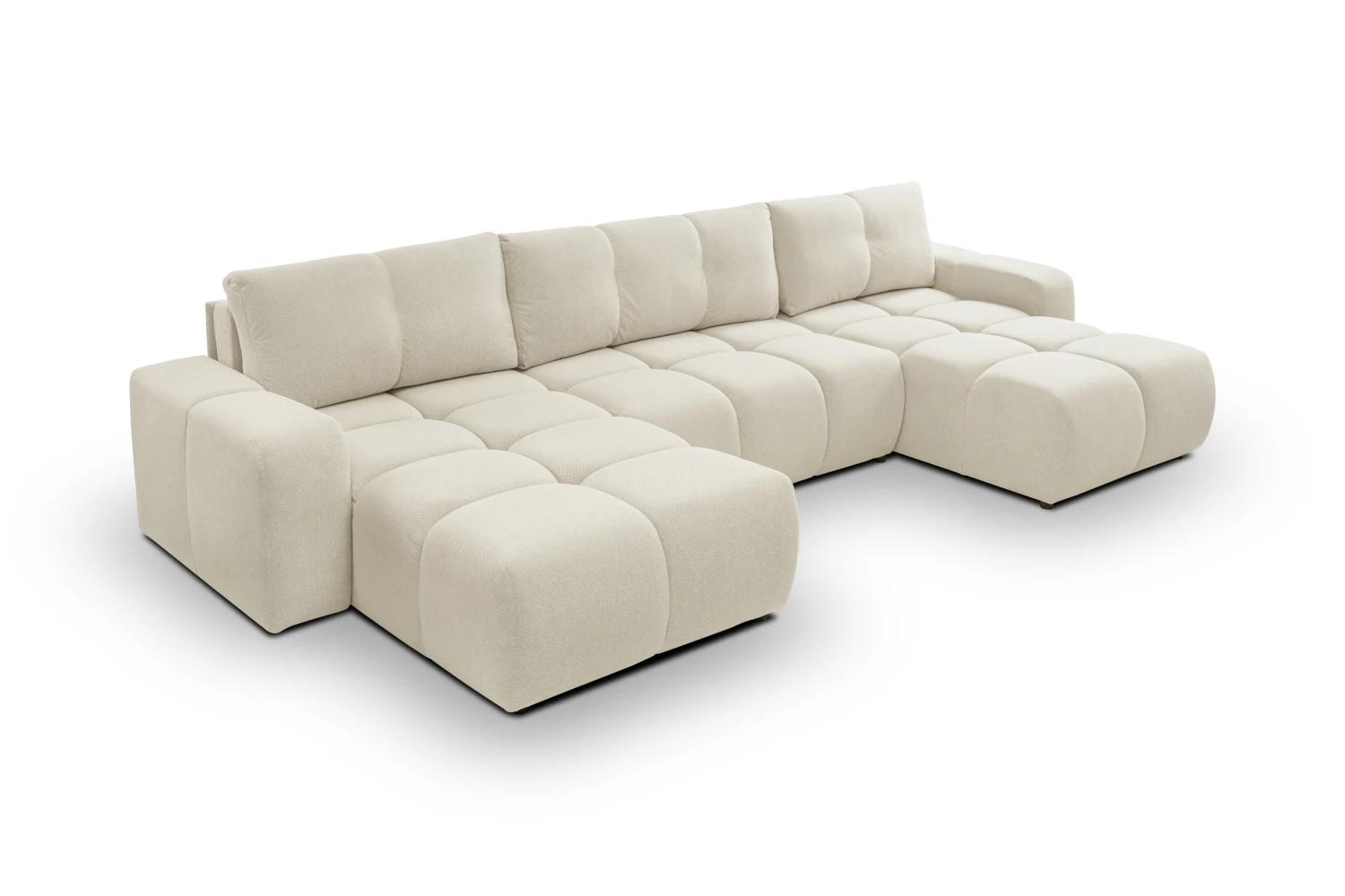 Narożnik U Mellow z funkcją spania i pojemnikiem na pościel to wyjątkowo komfortowy, modułowy mebel do nowoczesnego salonu. Obszerne, miękkie siedziska i luźne poduszki oparciowe zapewniają wygodę całej rodzinie, a duża powierzchnia spania 140x303 cm sprawia, że narożnik świetnie sprawdza się również jako łóżko dla gości.