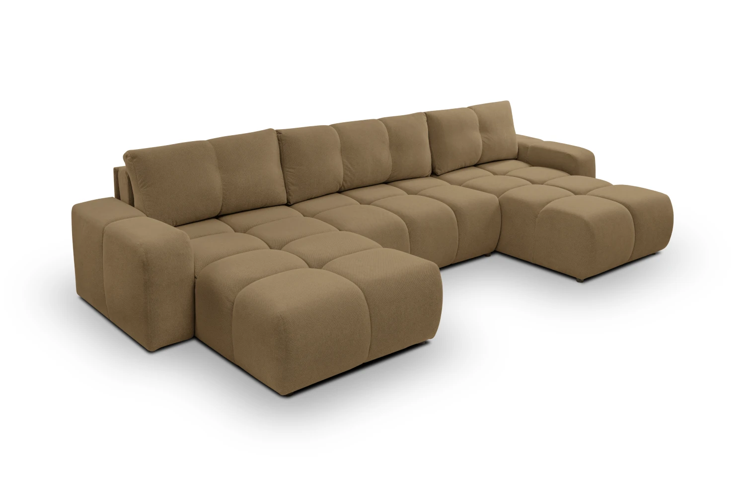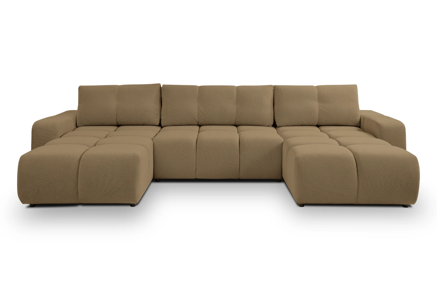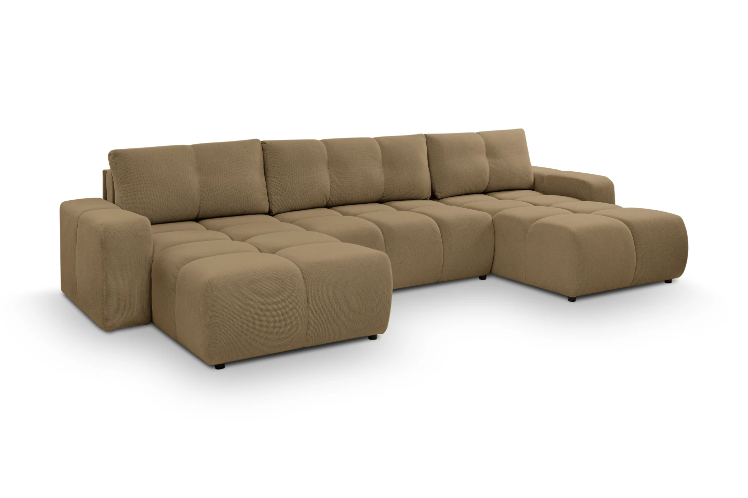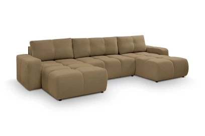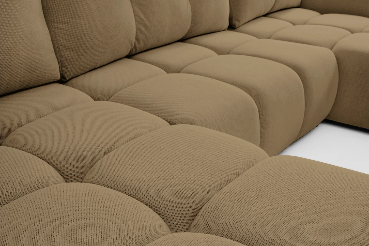 Narożnik U Mellow z funkcją spania i pojemnikiem na pościel to wyjątkowo komfortowy, modułowy mebel do nowoczesnego salonu. Obszerne, miękkie siedziska i luźne poduszki oparciowe zapewniają wygodę całej rodzinie, a duża powierzchnia spania 140x303 cm sprawia, że narożnik świetnie sprawdza się również jako łóżko dla gości.