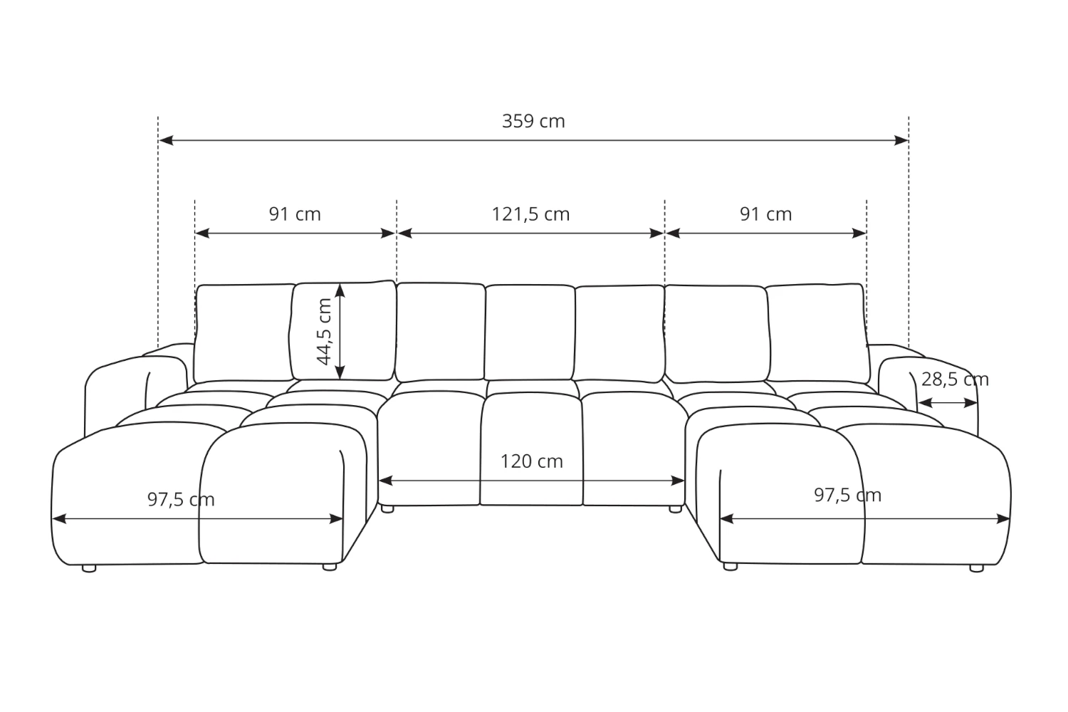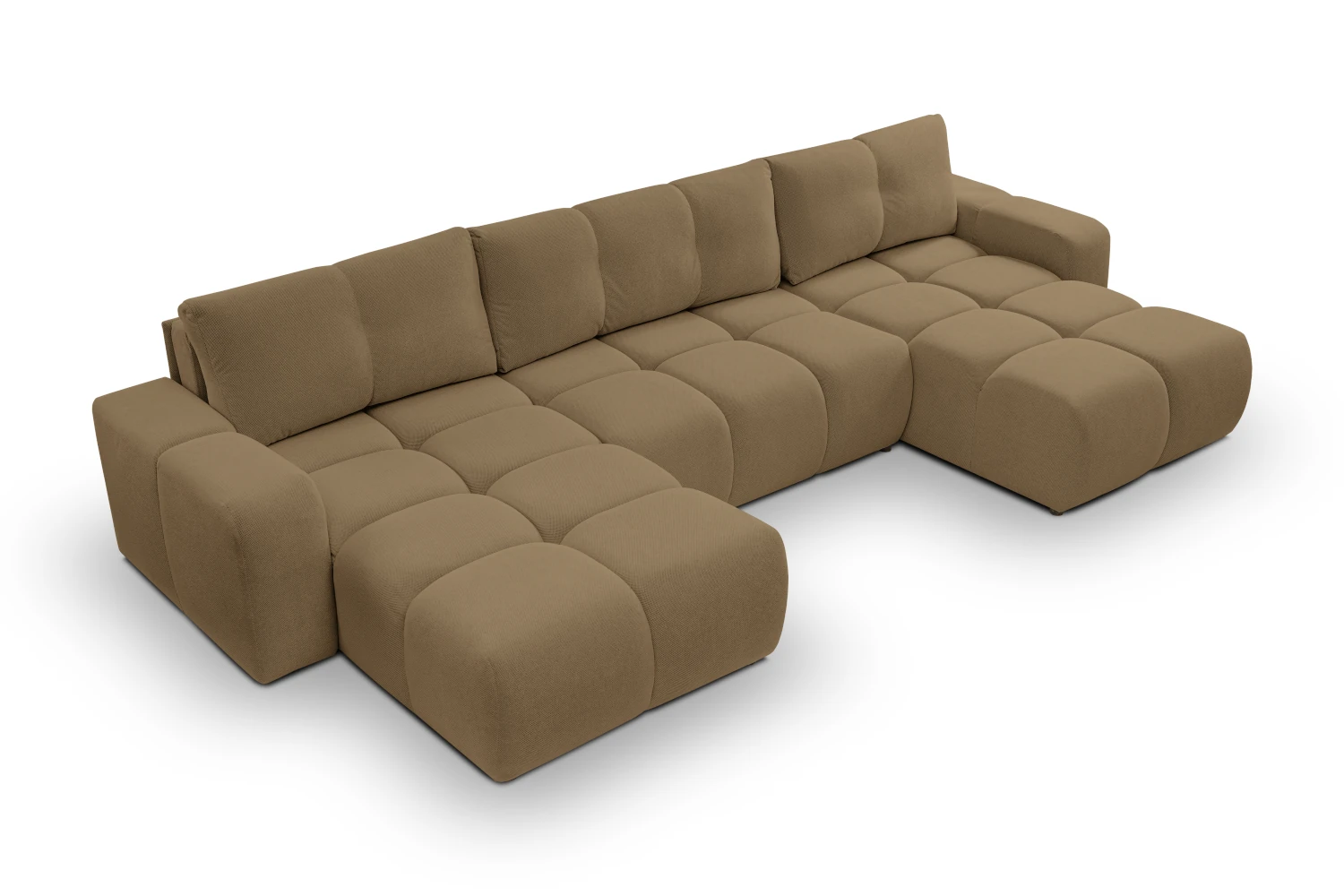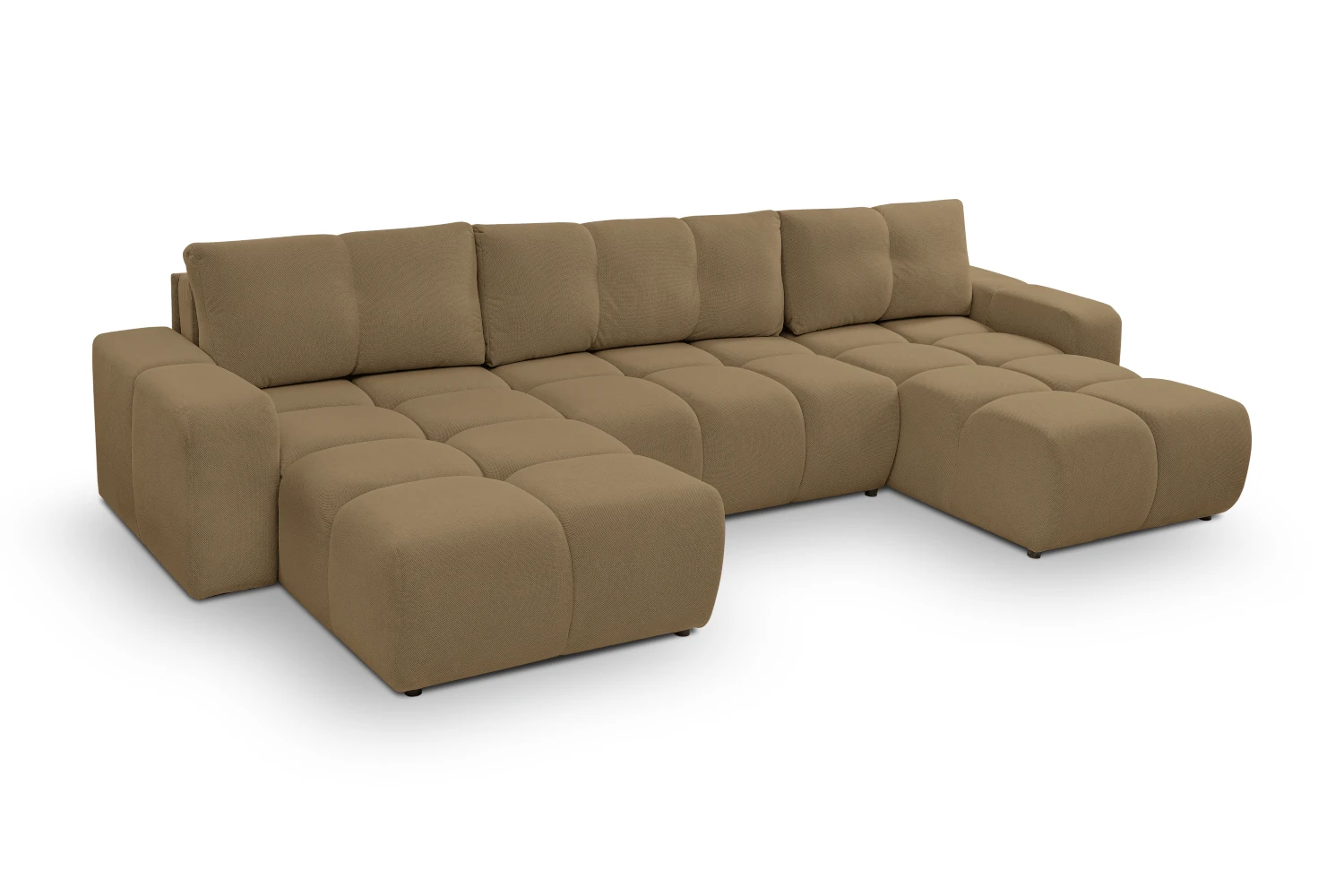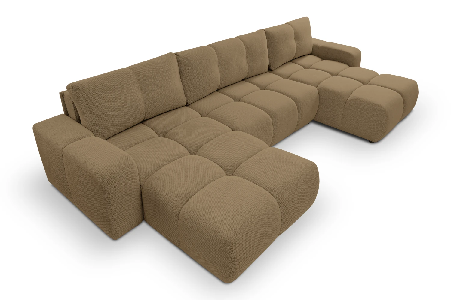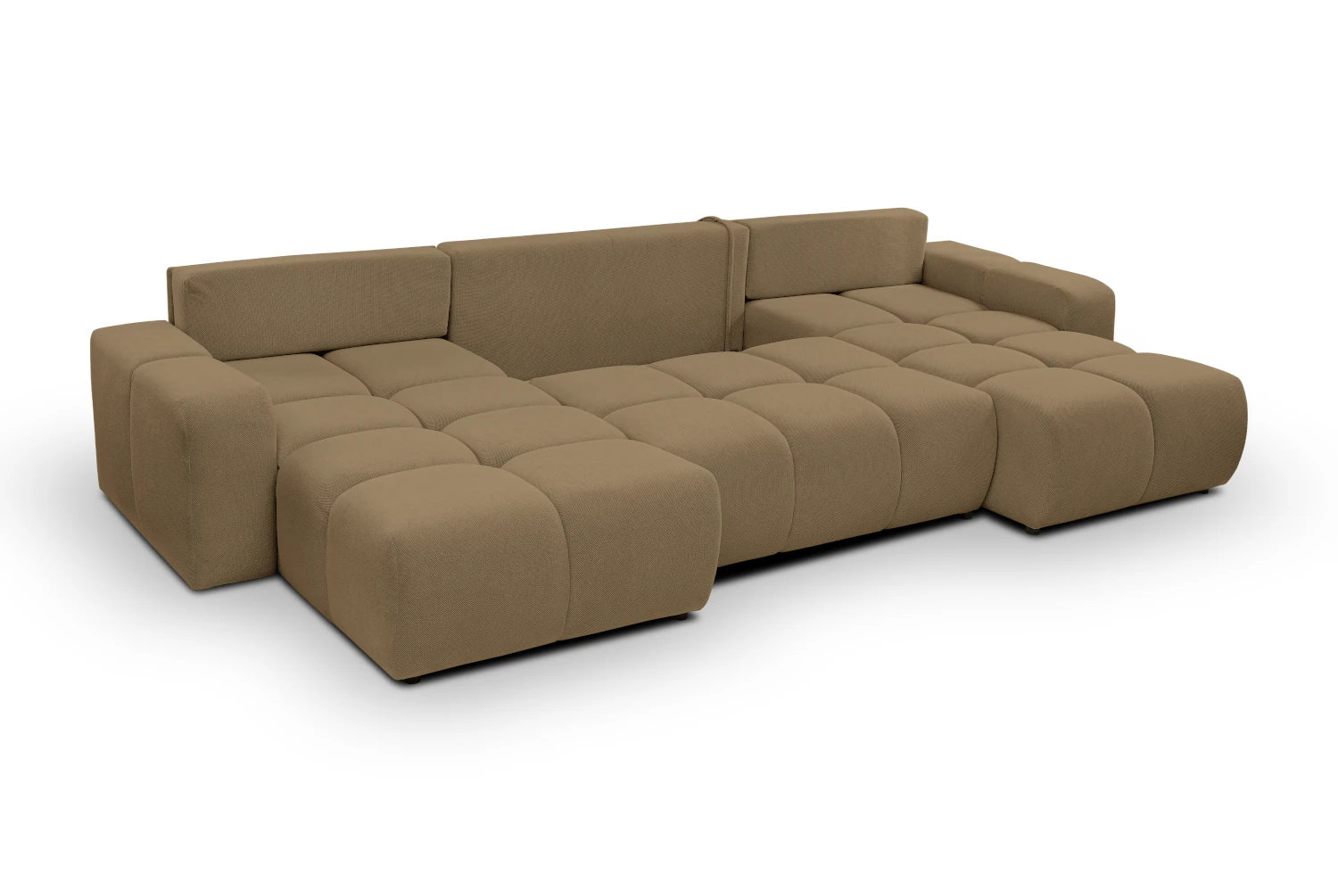 Narożnik U Mellow z funkcją spania i pojemnikiem na pościel to wyjątkowo komfortowy, modułowy mebel do nowoczesnego salonu. Obszerne, miękkie siedziska i luźne poduszki oparciowe zapewniają wygodę całej rodzinie, a duża powierzchnia spania 140x303 cm sprawia, że narożnik świetnie sprawdza się również jako łóżko dla gości.