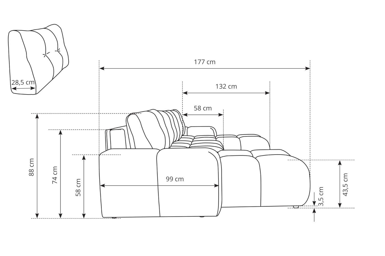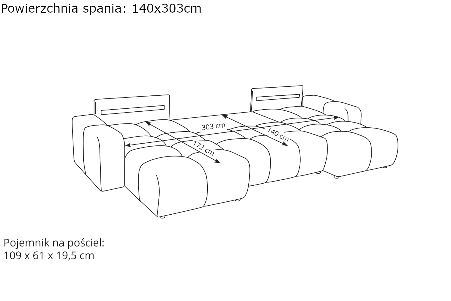 Dzięki wbudowanej funkcji spania typu DL narożnik w kilka chwil zamienia się w wygodne łóżko o powierzchni 140x303 cm. To komfortowe i praktyczne rozwiązanie, gdy potrzebujesz dodatkowego miejsca noclegowego. Pod siedziskiem ukryto pojemnik na pościel, w którym bez problemu zmieścisz kołdry, poduszki czy koc - utrzymanie porządku w salonie staje się dzięki temu dużo łatwiejsze.