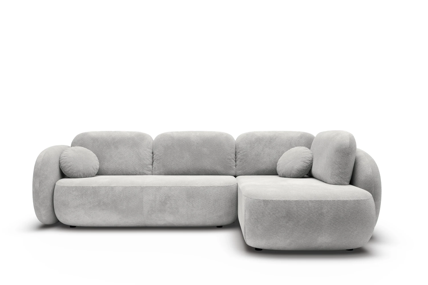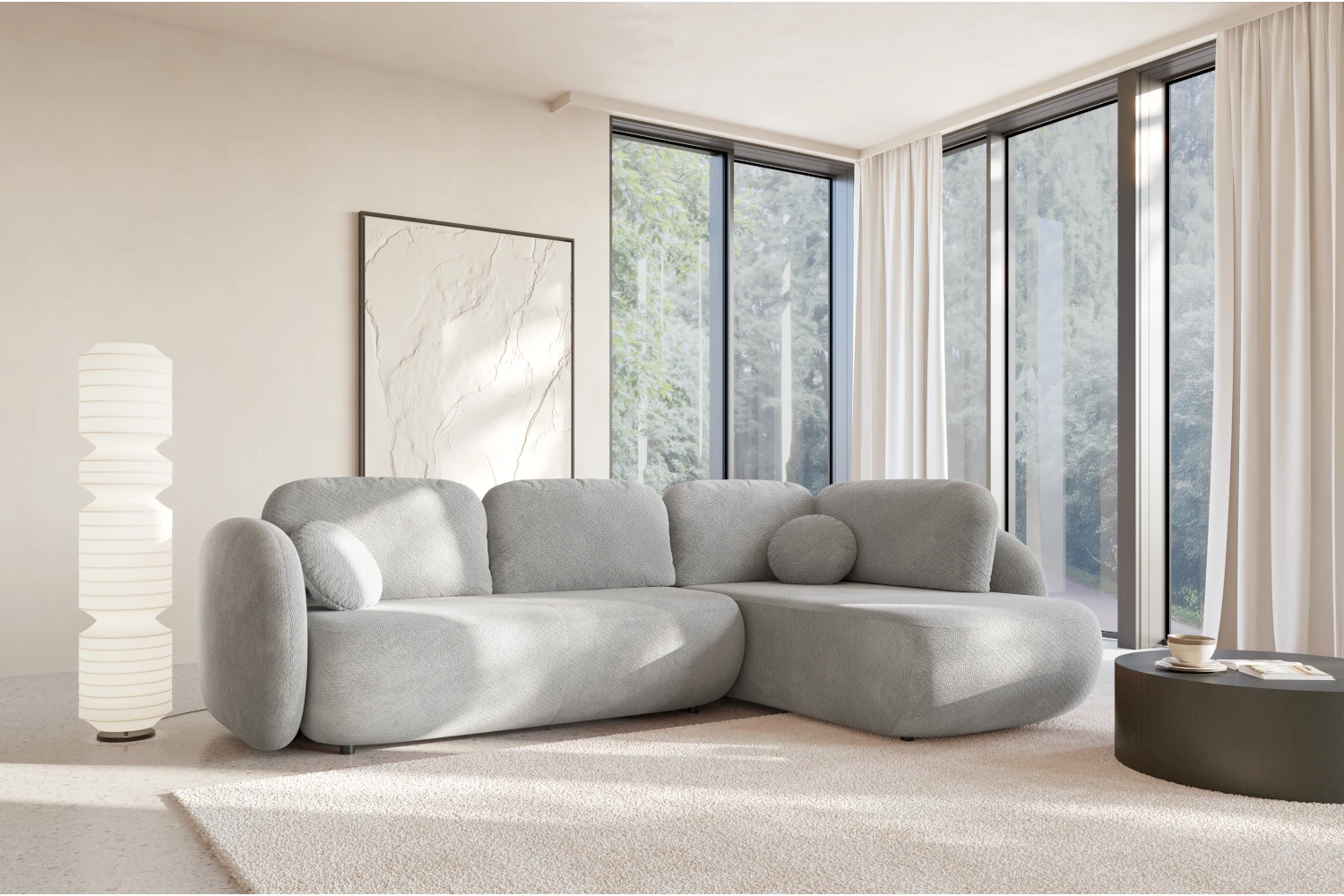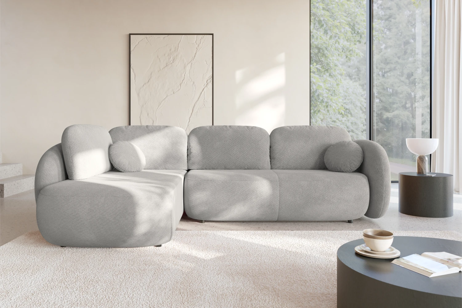 Narożnik Mochi z funkcją spania i pojemnikiem na pościel łączy designerską, zaokrągloną linię z wysokim komfortem wypoczynku. Miękkie poduchy oparciowe, szerokie siedzisko i wygodne podłokietniki tworzą idealne miejsce do popołudniowego relaksu, rodzinnych seansów filmowych i przyjmowania gości.