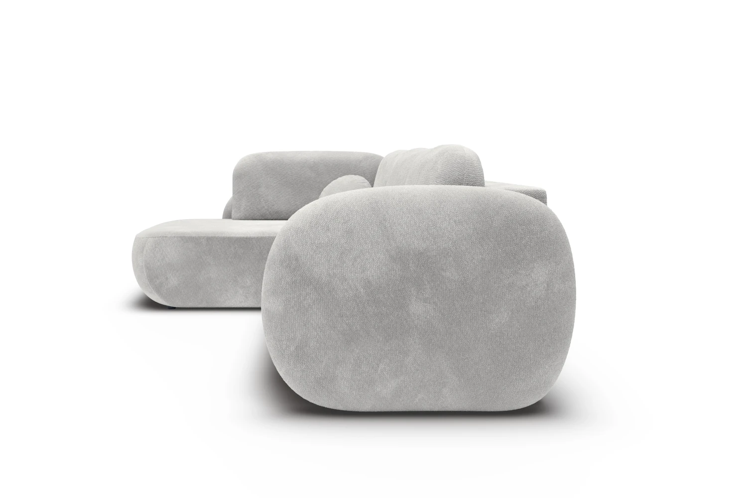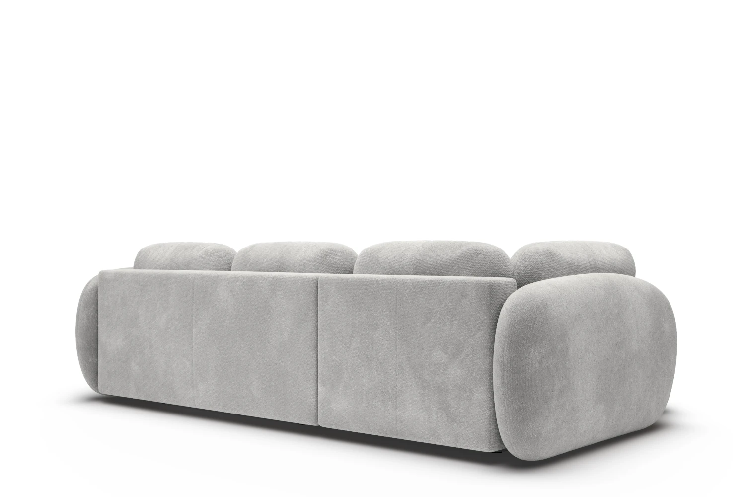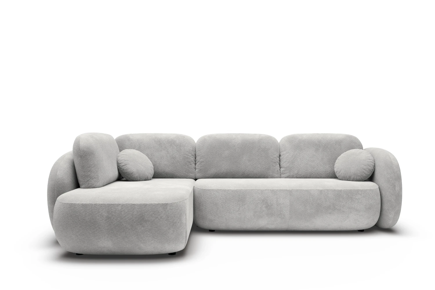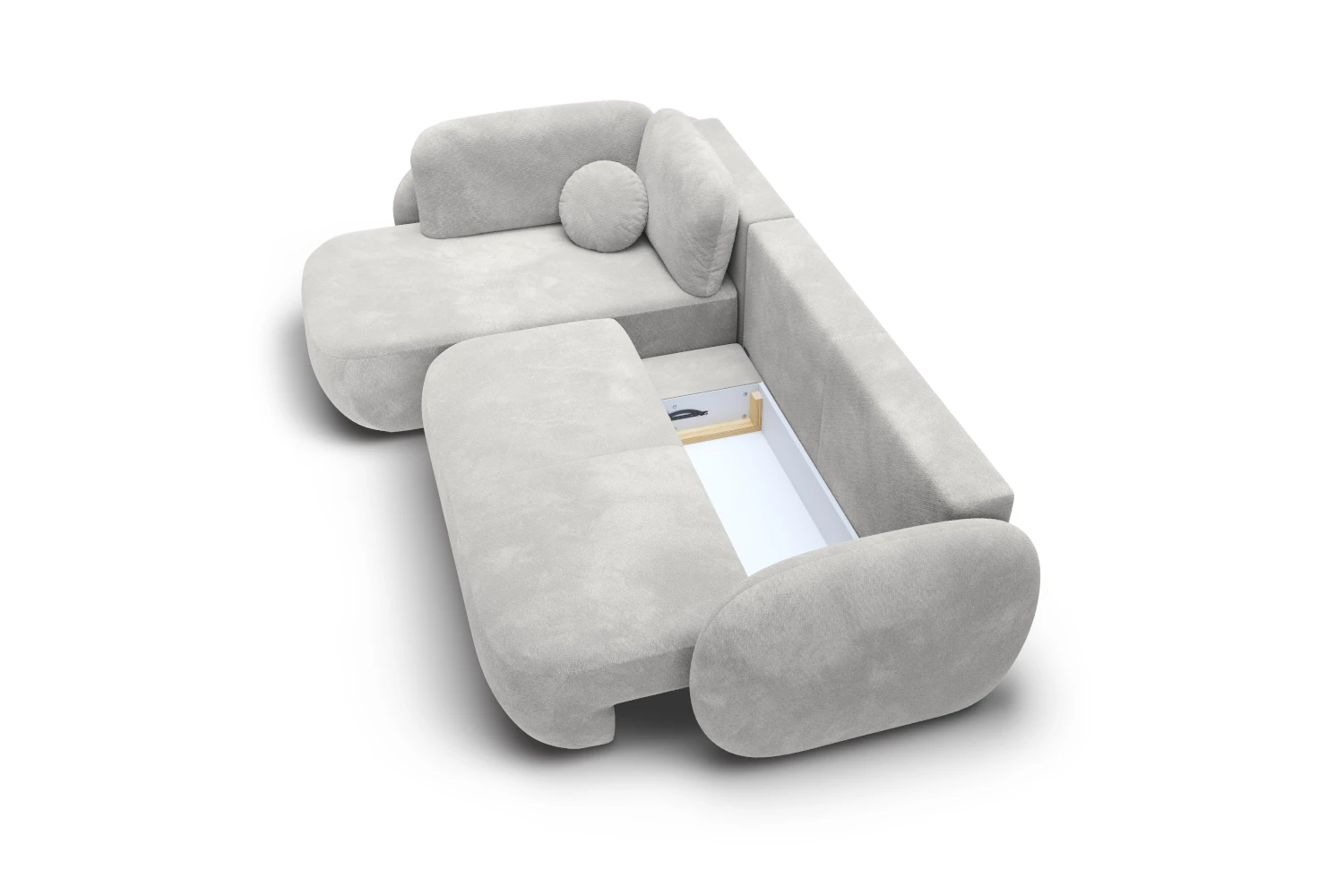 Narożnik Mochi z funkcją spania i pojemnikiem na pościel łączy designerską, zaokrągloną linię z wysokim komfortem wypoczynku. Miękkie poduchy oparciowe, szerokie siedzisko i wygodne podłokietniki tworzą idealne miejsce do popołudniowego relaksu, rodzinnych seansów filmowych i przyjmowania gości.
