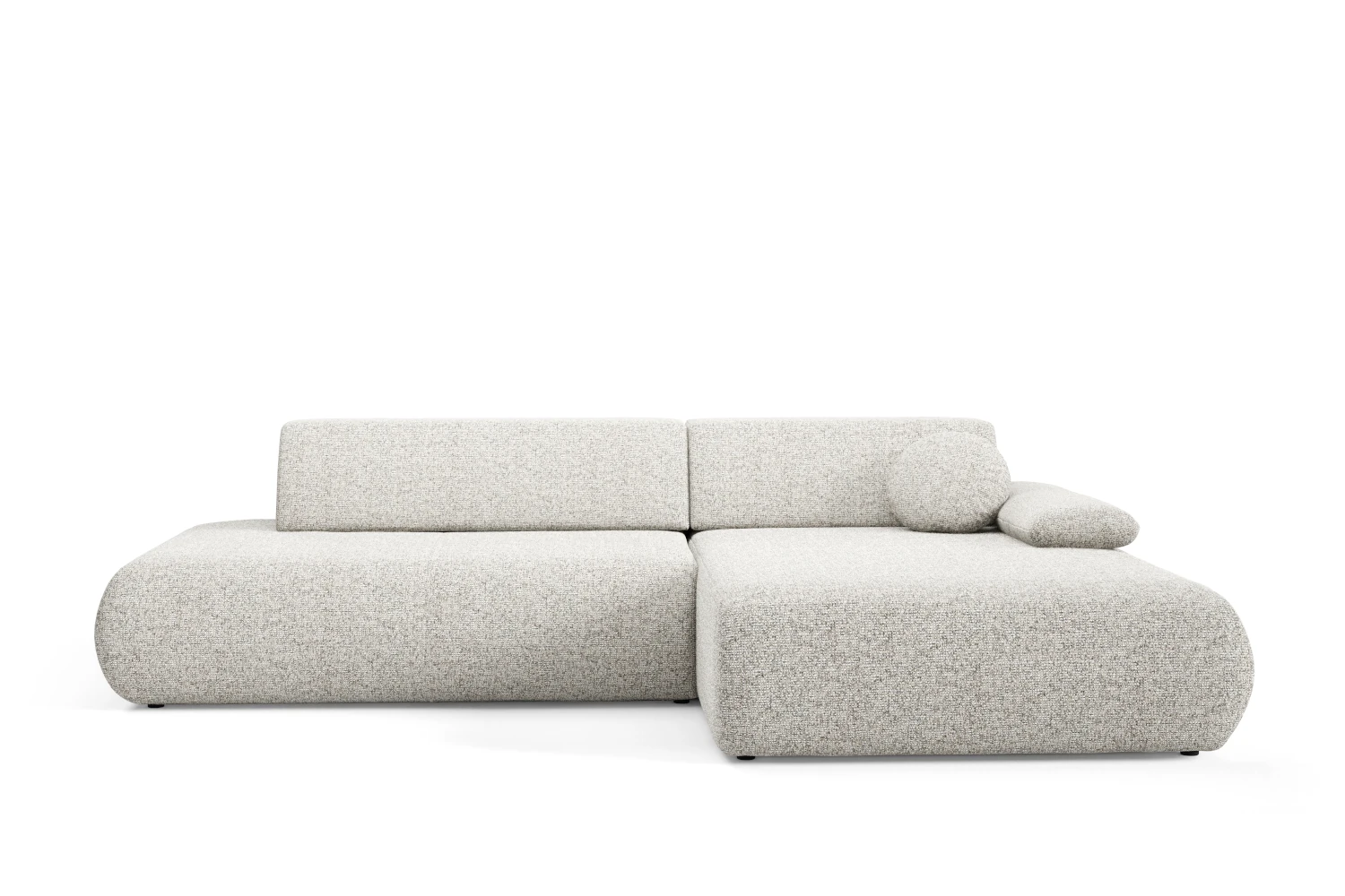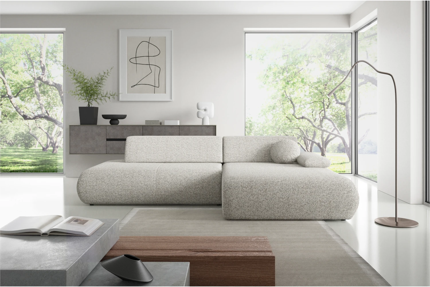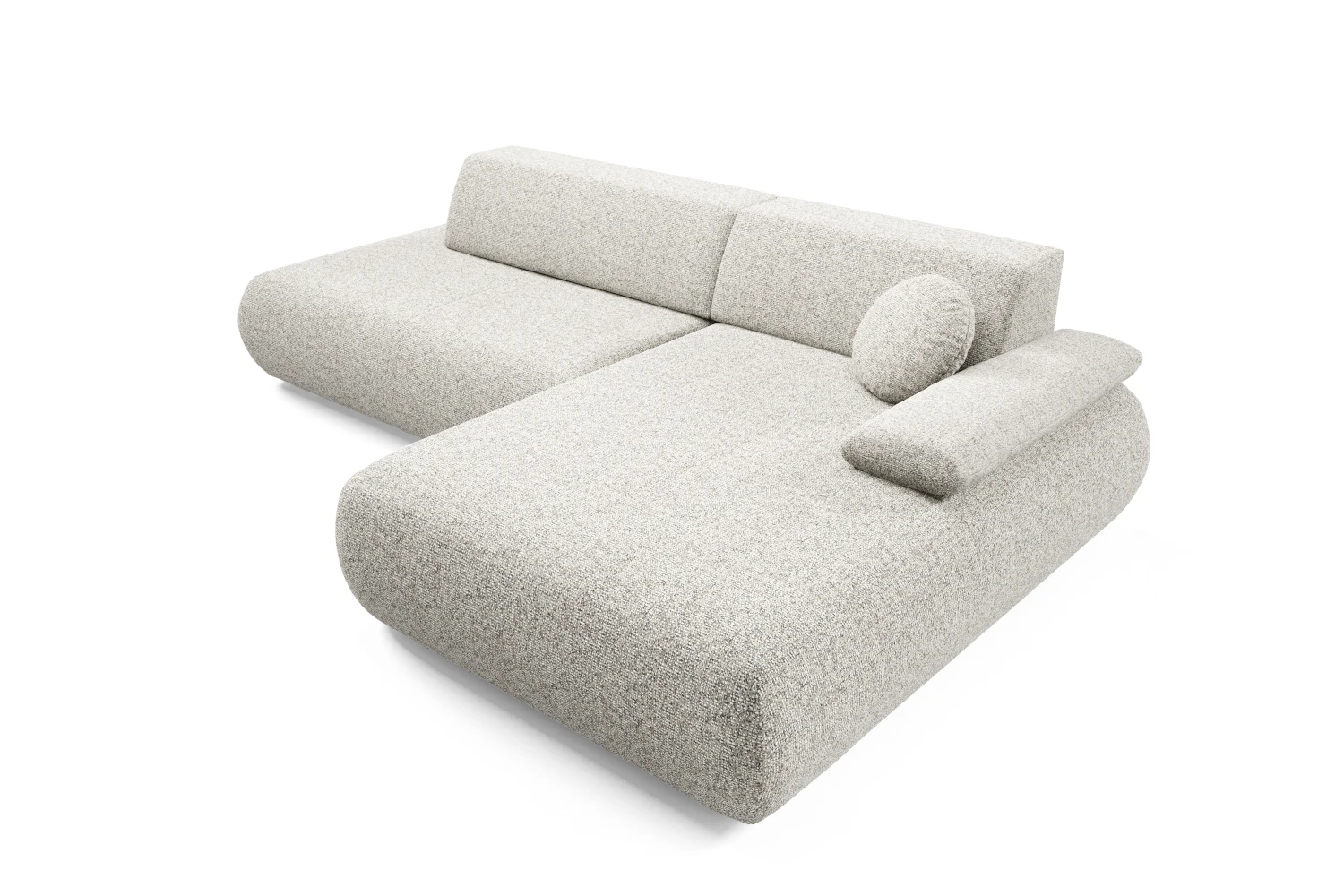 Narożnik z funkcją spania i pojemnikiem Duna to nowoczesny narożnik w kształcie litery L, który łączy miękką, obłą formę z wysoką funkcjonalnością. Wykonany z przyjemnej w dotyku tkaniny Puente 09 w kolorze szarobeżowym melanżu, świetnie sprawdzi się zarówno w jasnych, jak i bardziej stonowanych aranżacjach salonu.