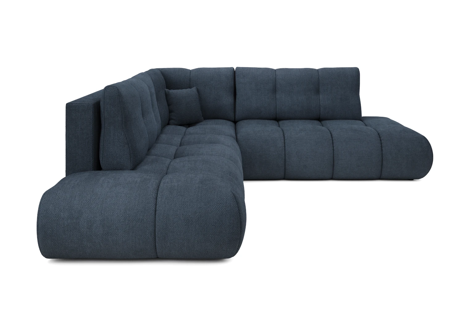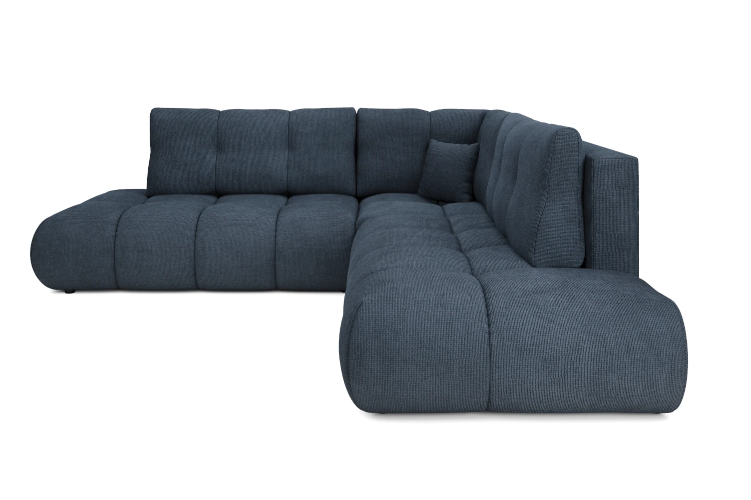 Luźne poduchy oparciowe zapewniając wygodne podparcie pleców, a szerokie, zaoblone siedziska zachęcają do wypoczynku w pozycji półleżącej. Tapicerowany tył pozwala ustawić narożnik także na środku pokoju, tworząc efektowną strefę relaksu.