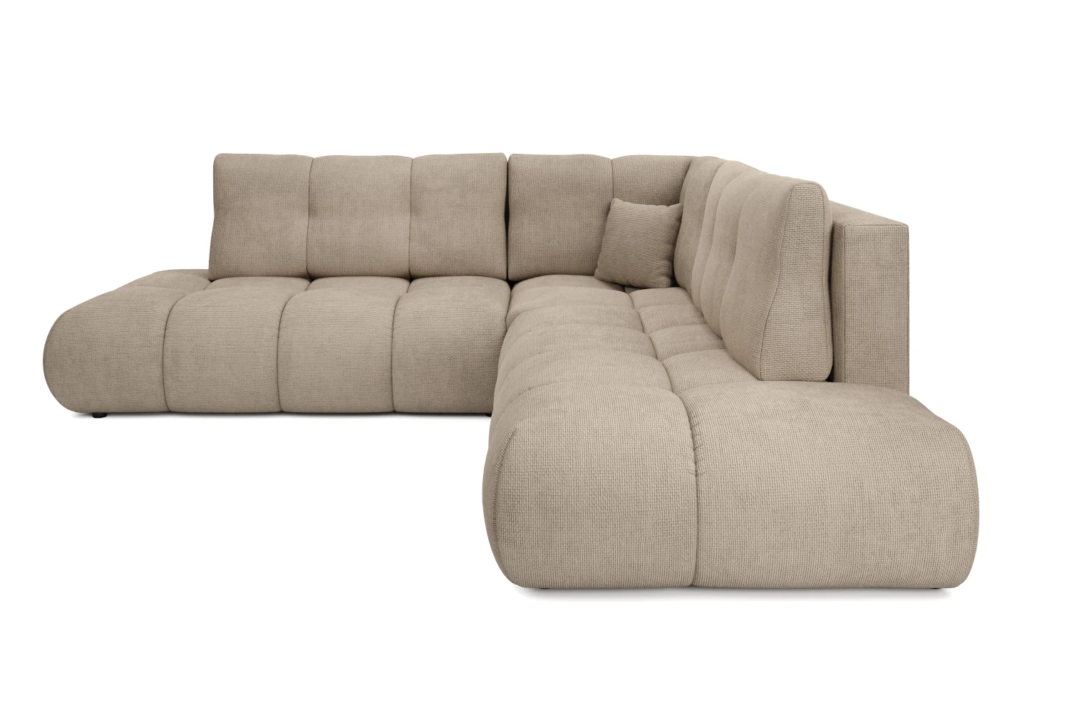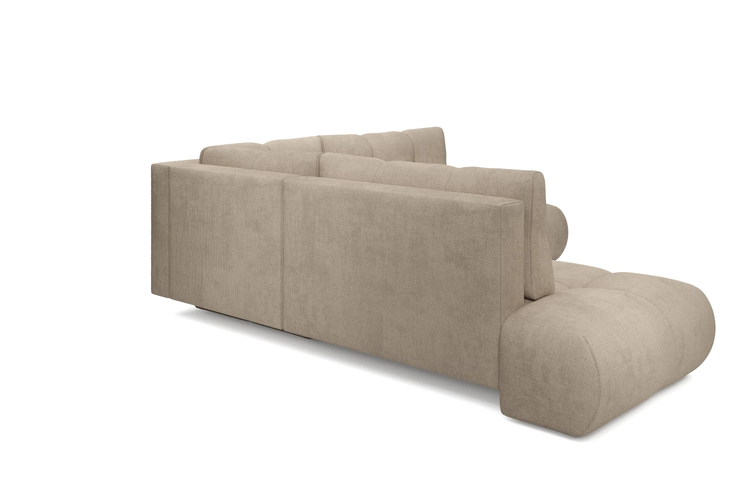 Luźne poduchy oparciowe zapewniając wygodne podparcie pleców, a szerokie, zaoblone siedziska zachęcają do wypoczynku w pozycji półleżącej. Tapicerowany tył pozwala ustawić narożnik także na środku pokoju, tworząc efektowną strefę relaksu.