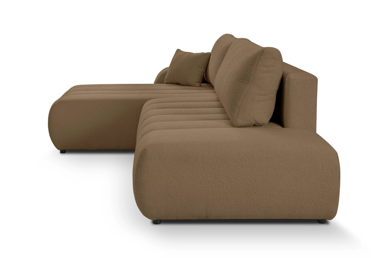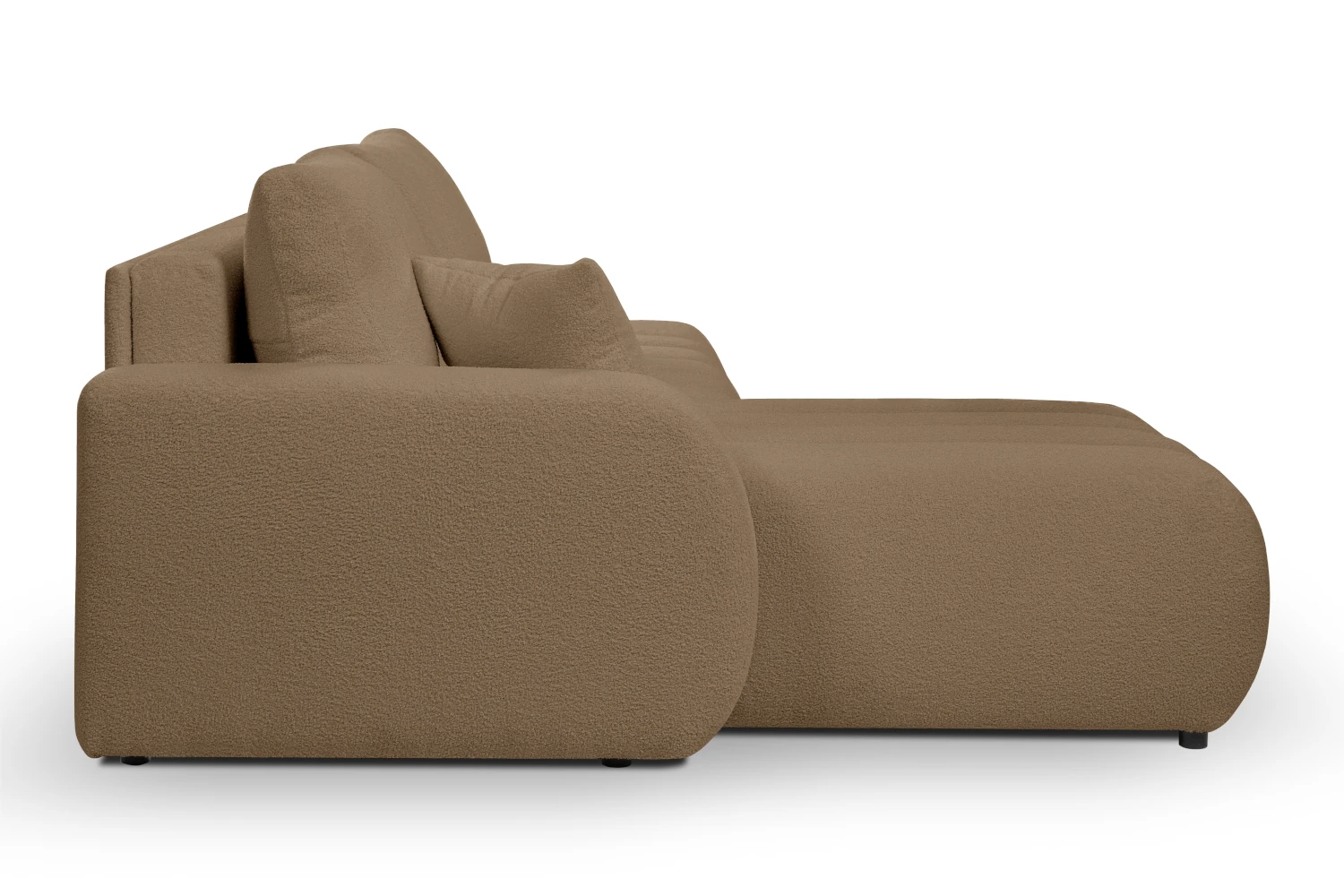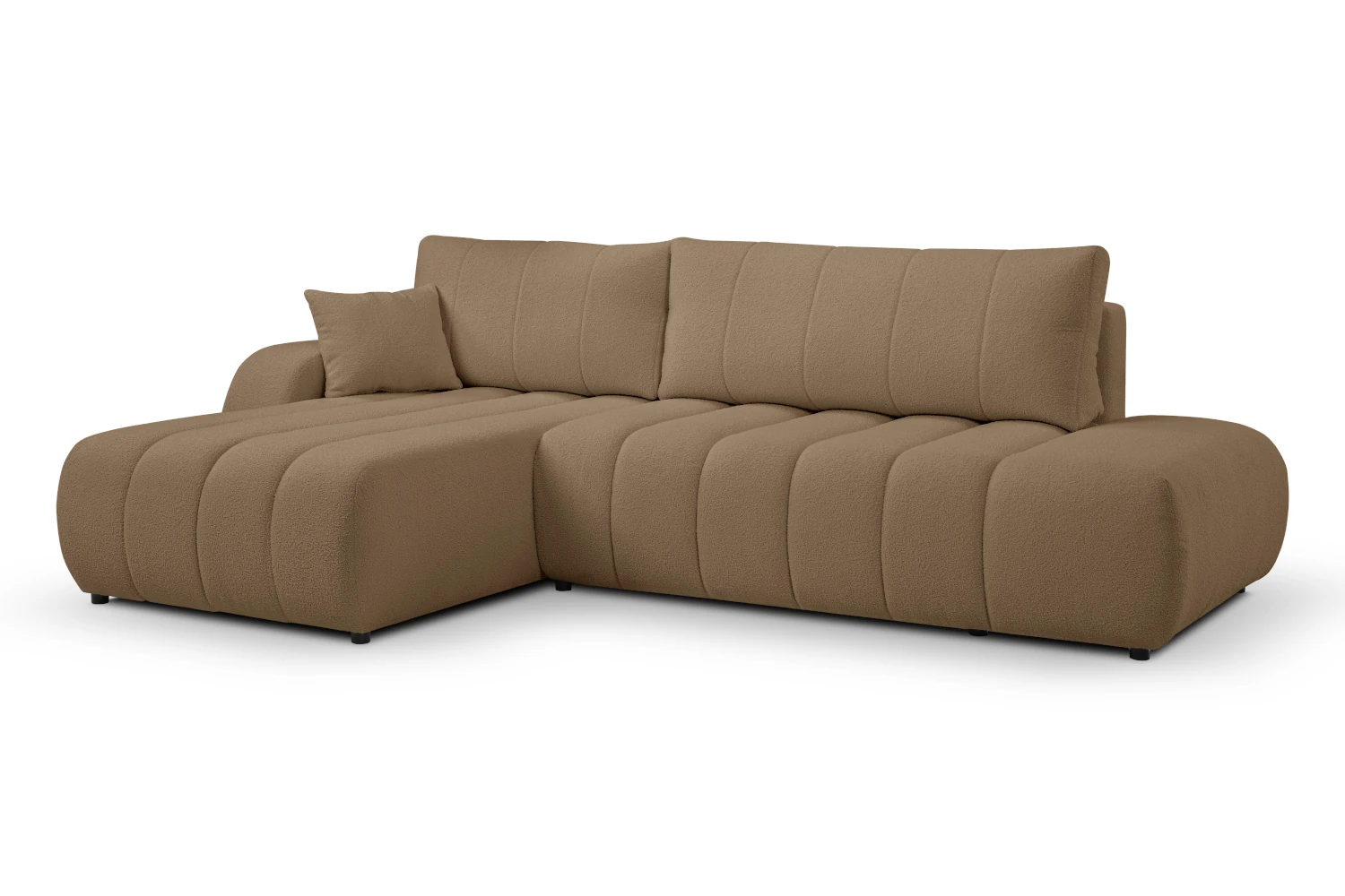 W siedzisku znajduje się także pojemny schowek na pościel, idealny na kołdry, poduszki czy dodatkowy koc. To praktyczne rozwiązanie, które pozwala lepiej zorganizować przestrzeń w salonie i utrzymać porządek nawet w niewielkim mieszkaniu. O komfort oparcia dbają luźne poduszki oparciowe, które można dowolnie układać i dopasowywać do własnych potrzeb. Dodatkowa poduszka dekoracyjna dołączona do zestawu podkreśla przytulny charakter mebla. Tapicerowane plecy sprawiają, że narożnik prezentuje się znakomicie również ustawiony na środku pokoju, jako centralny punkt strefy wypoczynkowej.